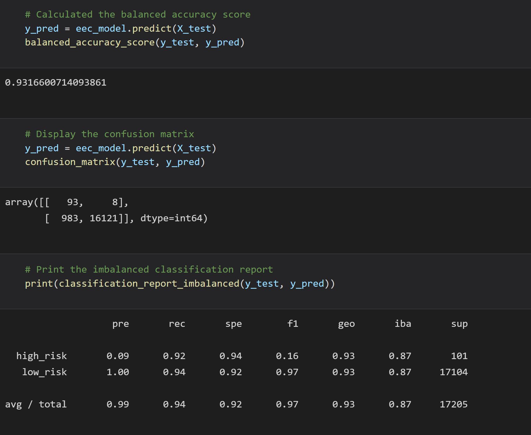 To summarize this analysis, using machine learning to accurately predict credit is high risk is not precise enough to be used. The Easy Ensemble Classifier had the highest scores and accuracy out of the 6-machine learning libraries, but it stilled had low precision and f1 score for high-risk which would cause a lot of low-risk credits to be falsely detected as high risk. I would not recommend any of these machine learning libraries because there still too much of a risk with not enough accuracy in predicting which credit would be high risk.