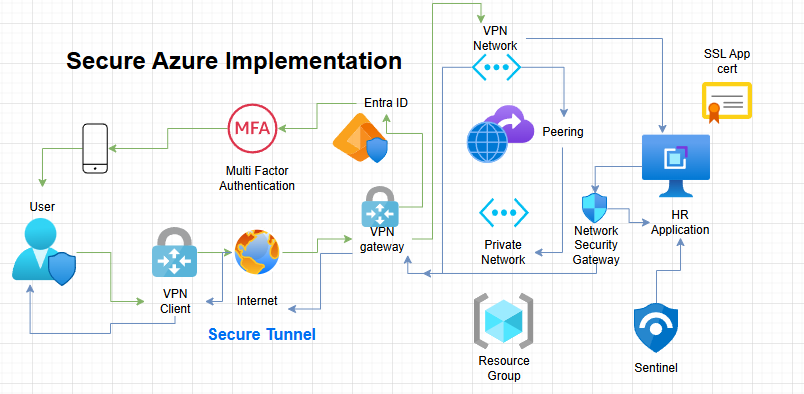 This architecture ensures the HR application is not publicly exposed and is only reachable through the VPN connection.