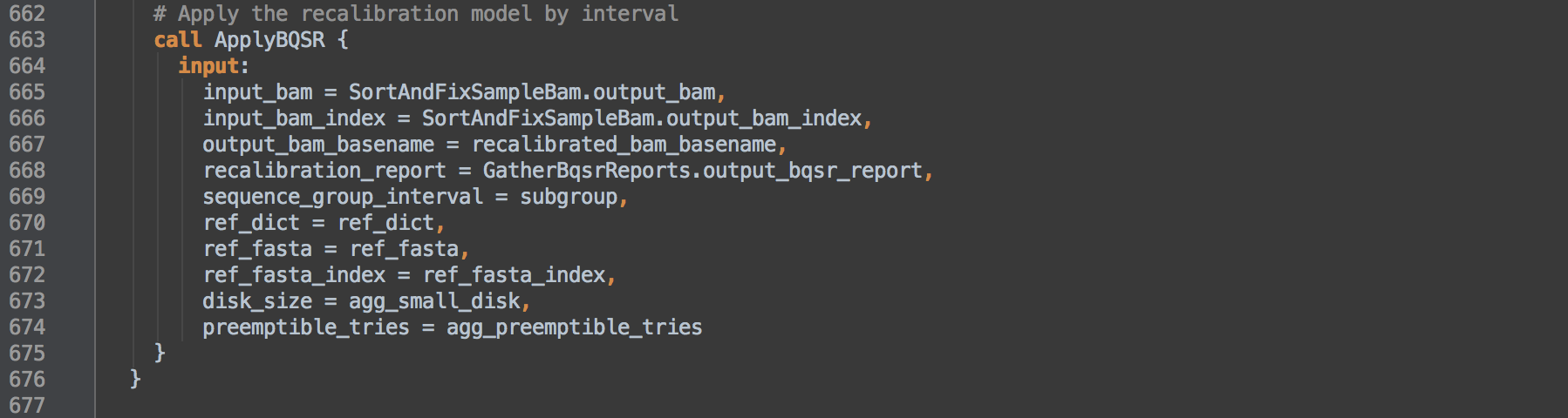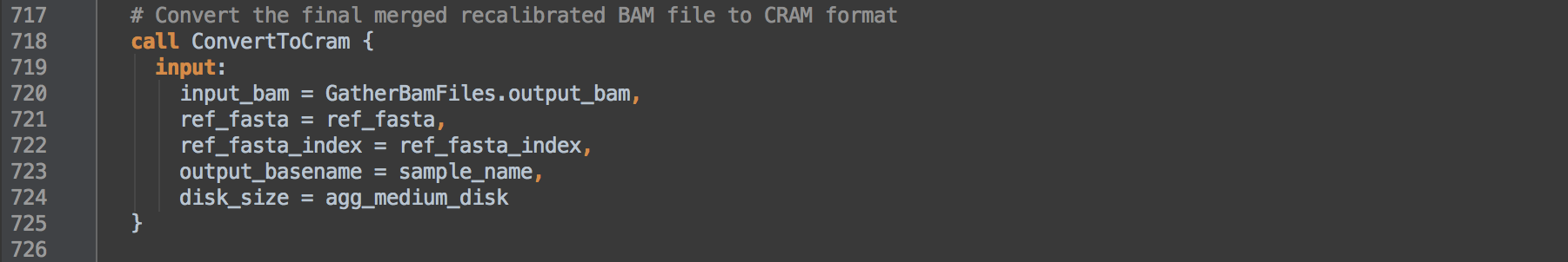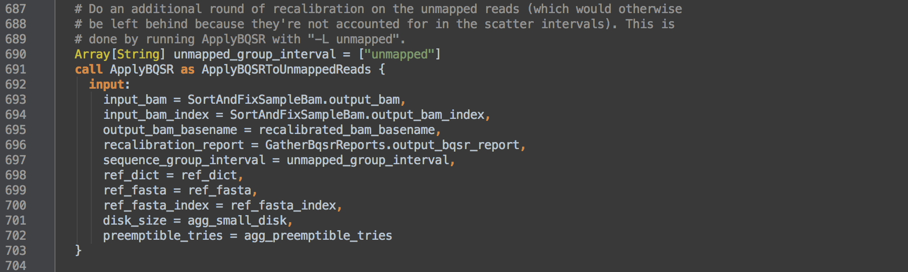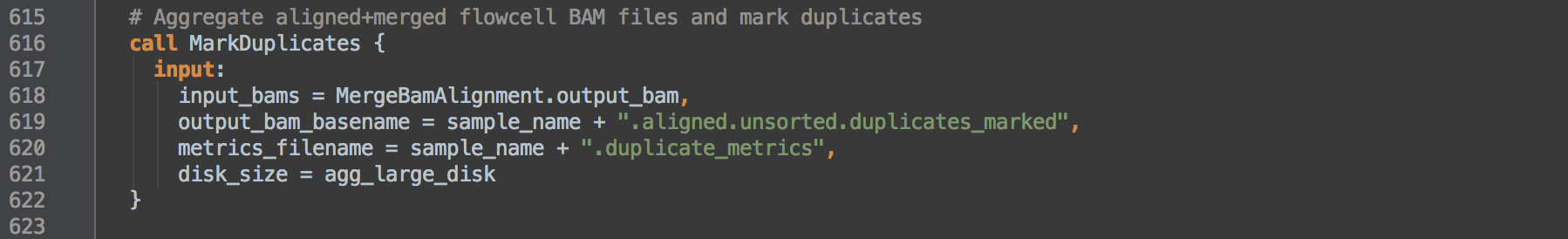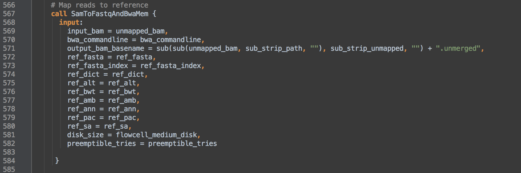 After the workflow name, the WORKFLOW definition lists the variables that can stand in for files, parameters or even parts of commands within tasks, e.g. the command for BWA alignment (L549). The actual files are given in an accompanying [**JSON** file](https://github.com/broadinstitute/wdl/blob/develop/scripts/broad_pipelines/PublicPairedSingleSampleWf_160720.inputs.json).