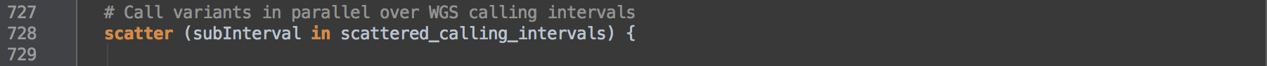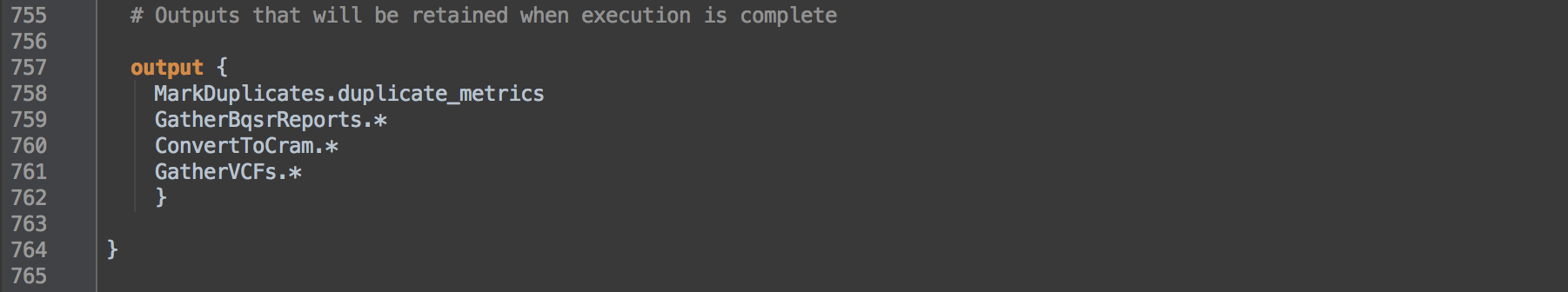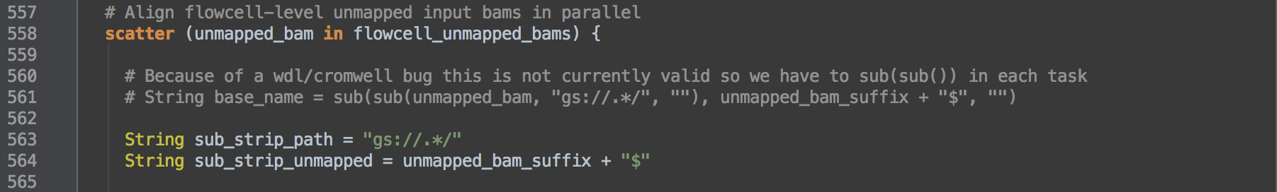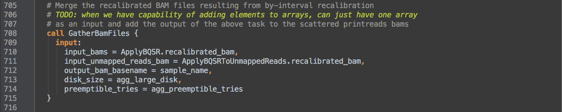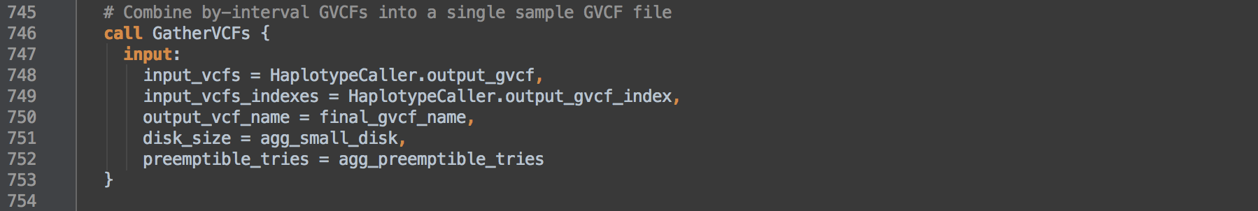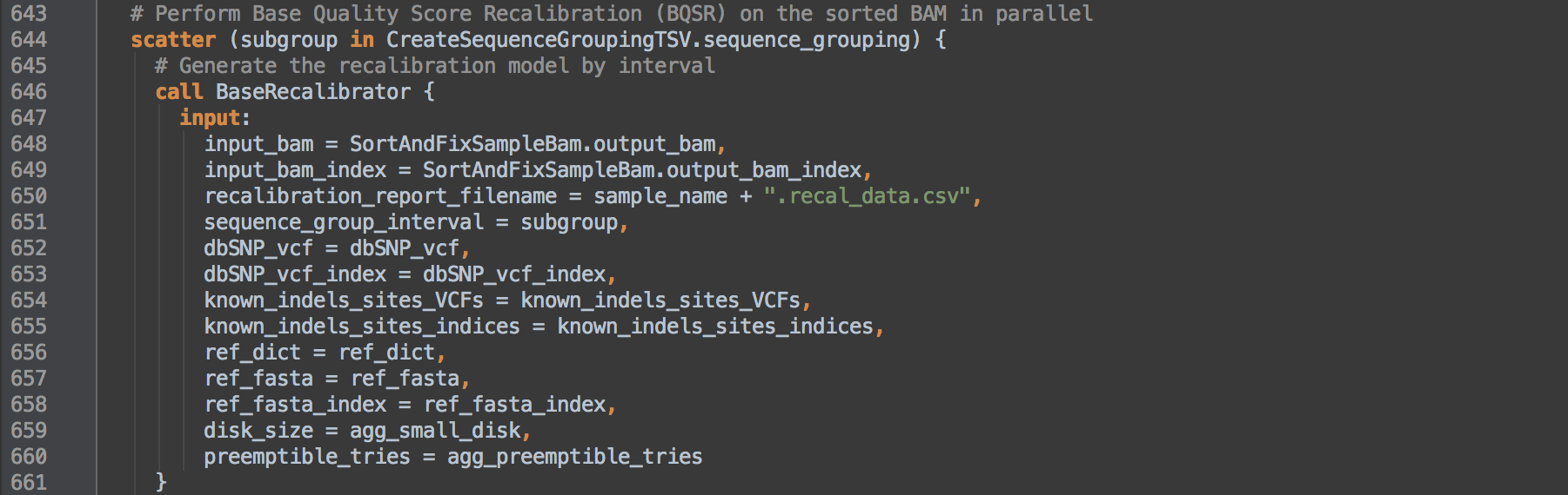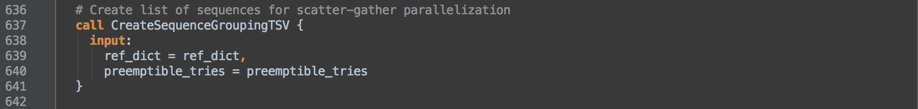 After the workflow name, the WORKFLOW definition lists the variables that can stand in for files, parameters or even parts of commands within tasks, e.g. the command for BWA alignment (L549). The actual files are given in an accompanying [**JSON** file](https://github.com/broadinstitute/wdl/blob/develop/scripts/broad_pipelines/PublicPairedSingleSampleWf_160720.inputs.json).
