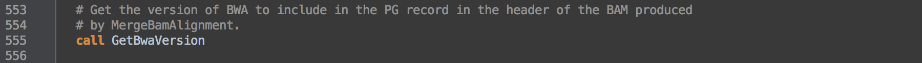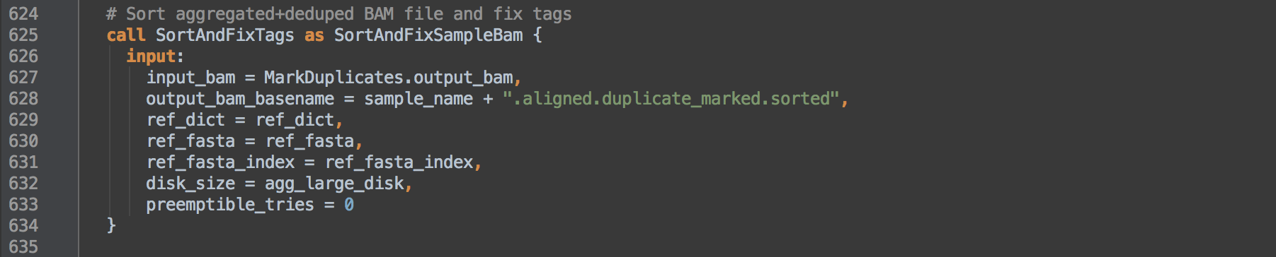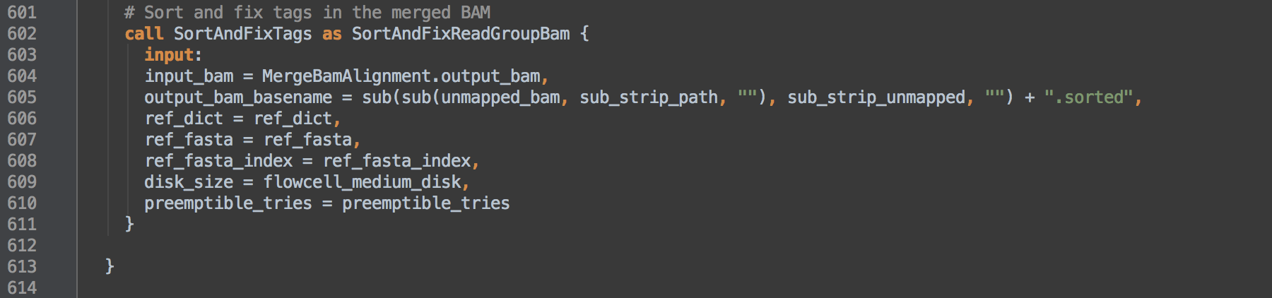 - 1.4: Calls task [SortAndFixTags](#SortAndFixTags) and uses [task aliasing](https://software.broadinstitute.org/wdl/userguide/plumbing#alias) to rename it **SortAndFixReadGroupBam**. The consequence of this is that the workflow can then differentiate outputs from those of [2.1]. This task coordinate sorts and indexes the alignments and fixes the `NM` and `UQ` tags whose calculations depend on coordinate sort order. This data transformation allows for validation with [ValidateSamFile](https://www.broadinstitute.org/gatk/guide/article?id=7571).