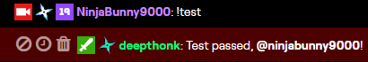 The bot comes pre-loaded with a !test command, if you want to try it in chat.