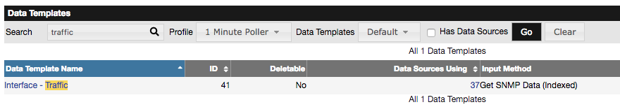 When viewing the data source templates, the "Data Source using" column lists 37 sources against the "Interface - Traffic". If you click the 37, you see that there are in fact, 931!