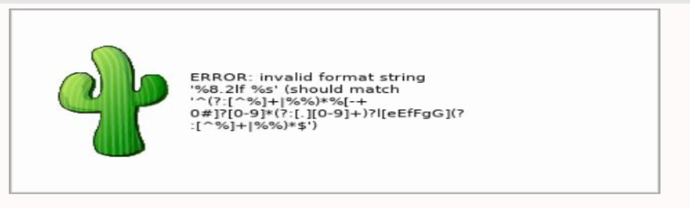 ERROR: invalid format string '%8.2lf %s' (should match '^(?:[^%]+|%%)%[-+ 0#]?[0-9](?:[.][0-9]+)?leEfFgG*$')