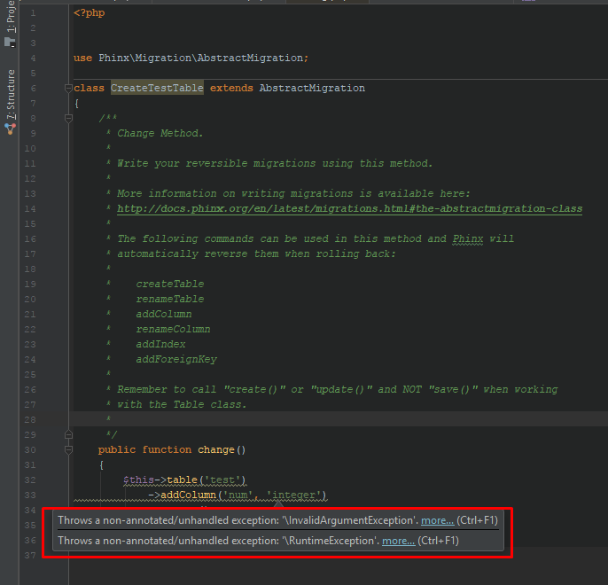 addColumnmethod is used in the migration. If you do not do this, my code editor (PHPStorm) swears at the line with the call to theaddColumnfunction.And most developers are faced with this problem when writing their migrations. I propose to simplify the writing of migrations and to indicate this text in advance in the comments. This does not make the migration code complex, but it helps when writing migrations.