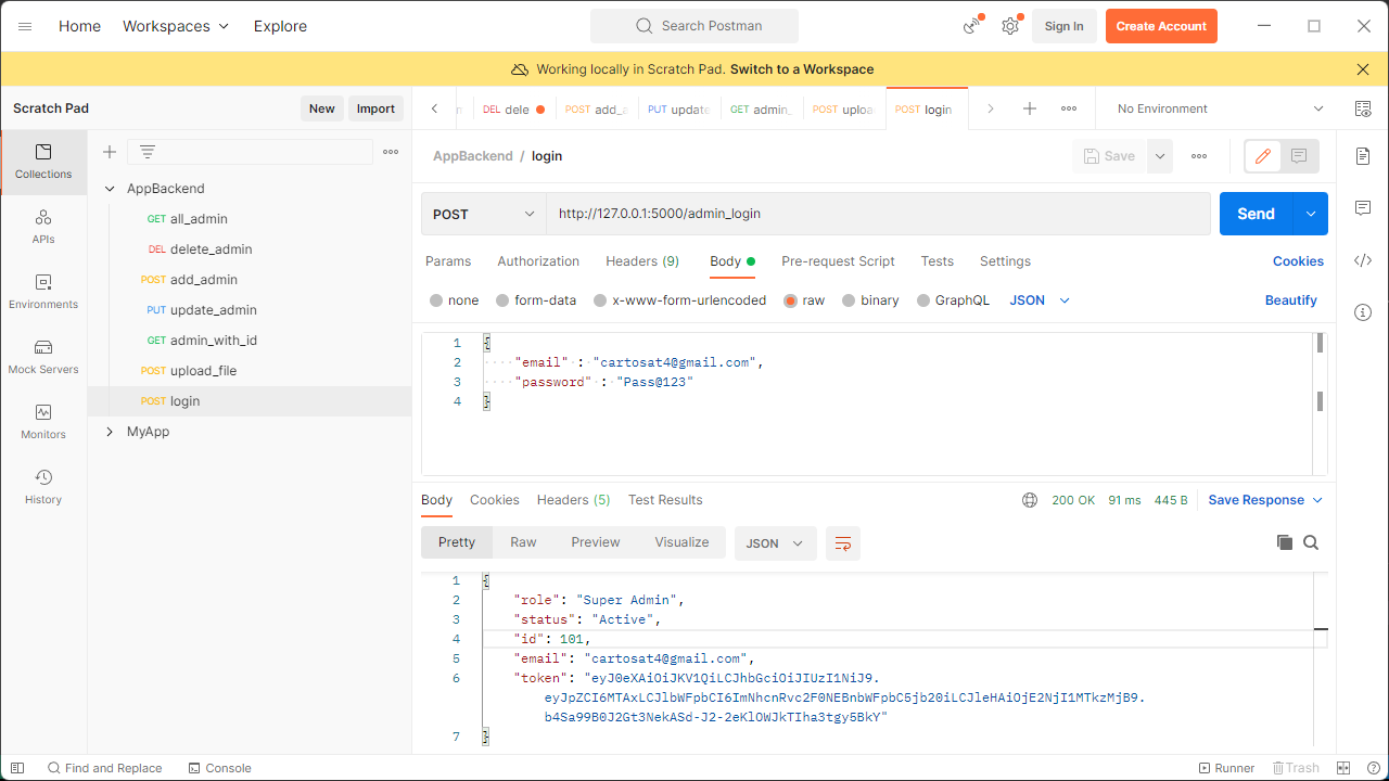 request and in postman under body section pass credential payload as shown in below image. - Example :- http://127.0.0.1:5000/admin_login .