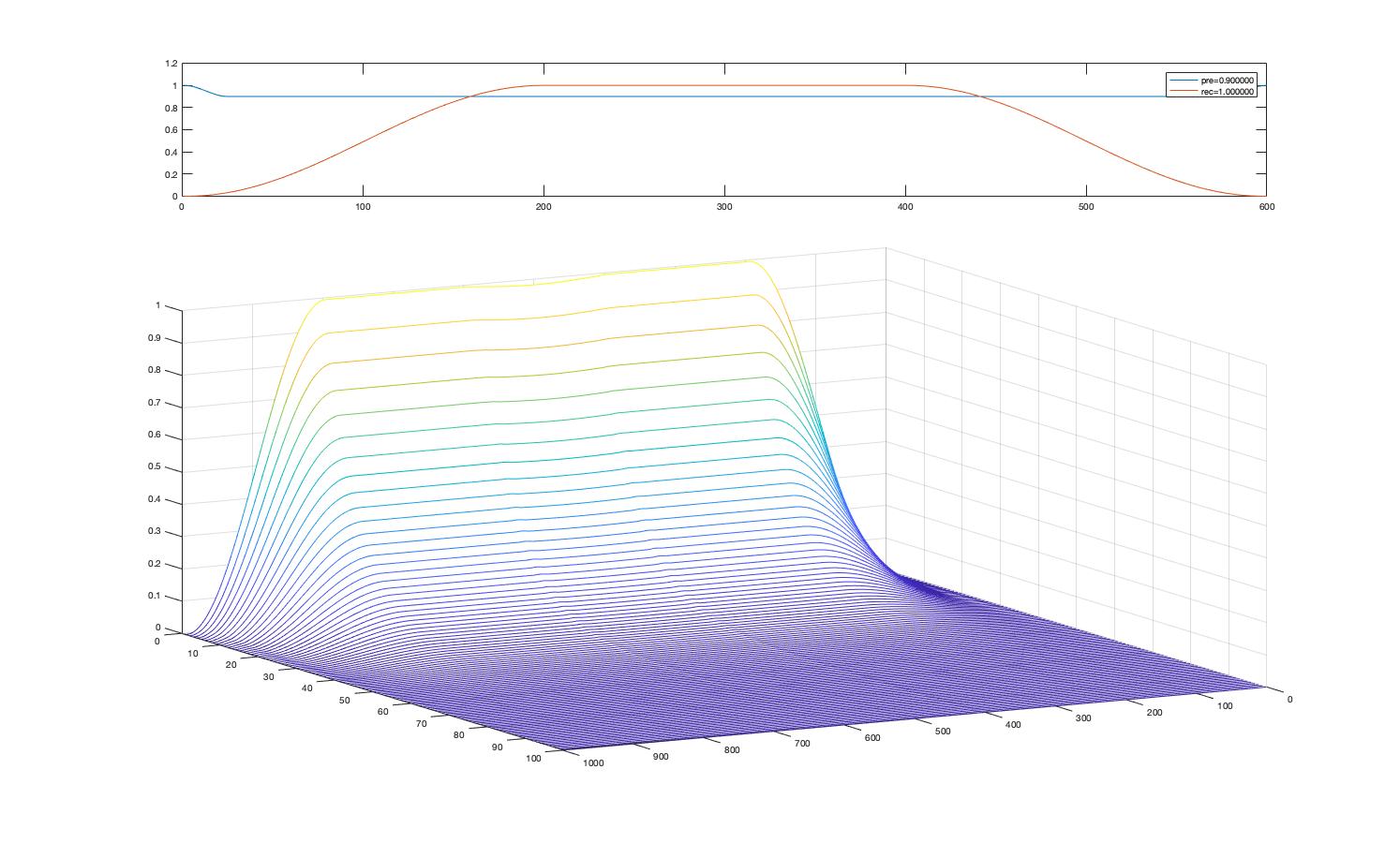 the waterfall image shows successive states of the looped portion of a buffer (including a long crossfade,) which is first recorded with white noise, and subsequently overdubbed with silence. the rec/pre fade curves (shown at the top) produce a "bump" in the recorded level around the fade point, where the pre-level is too high compared to the record level level.