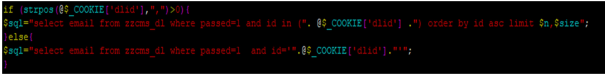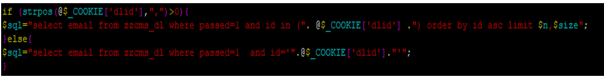 If index of ',' value in COOKIE[‘dlid’] parameter is bigger than 0 sql will be