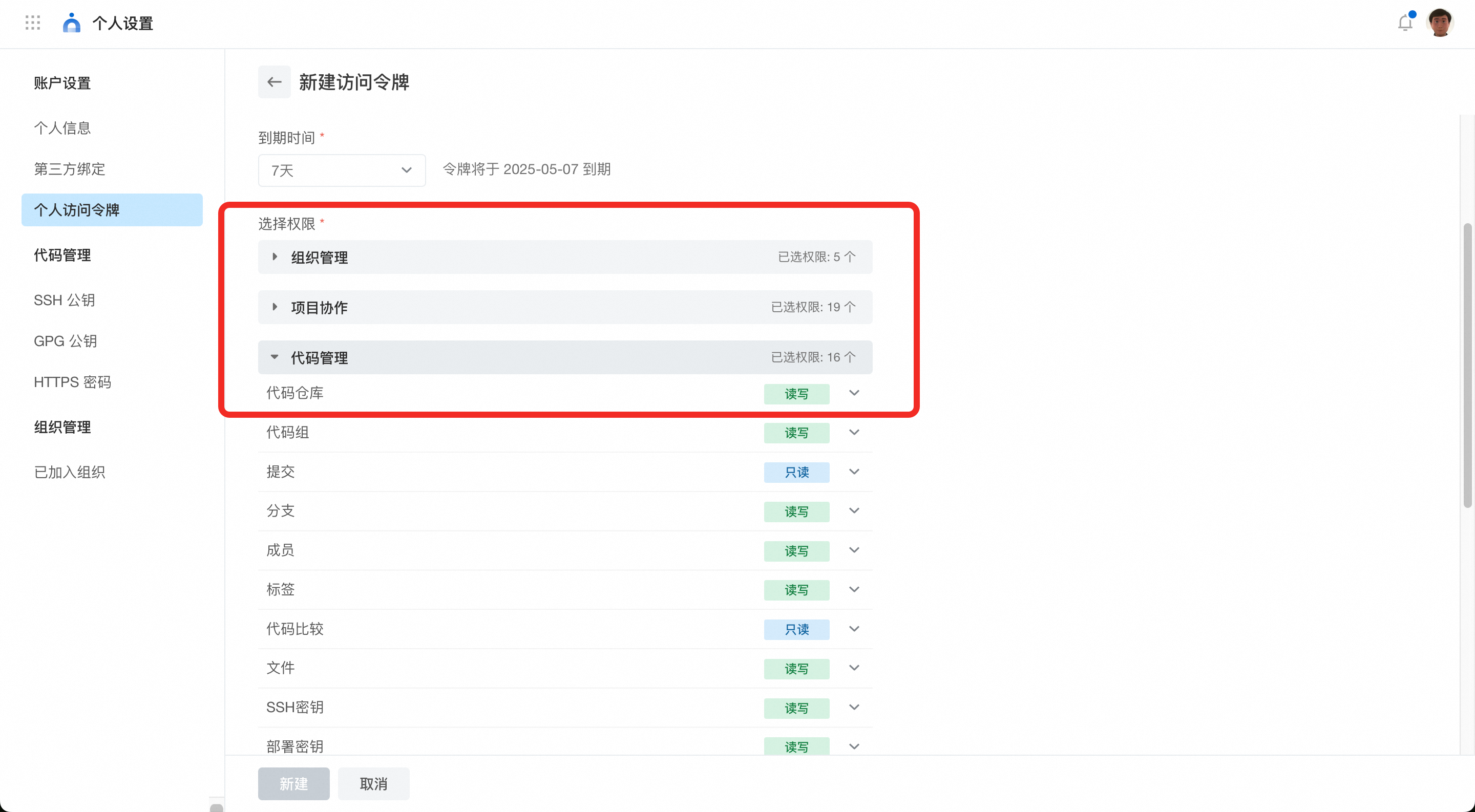 Alibaba Cloud Yunxiao Personal Access Token, click here to obtain. Grant read and write permissions to all APIs under organization management, project collaboration, and code management.