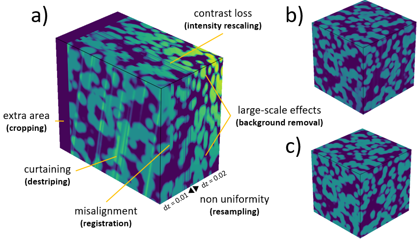 Illustration of a FIB-SEM image correction using some of the PyStack3D process steps.