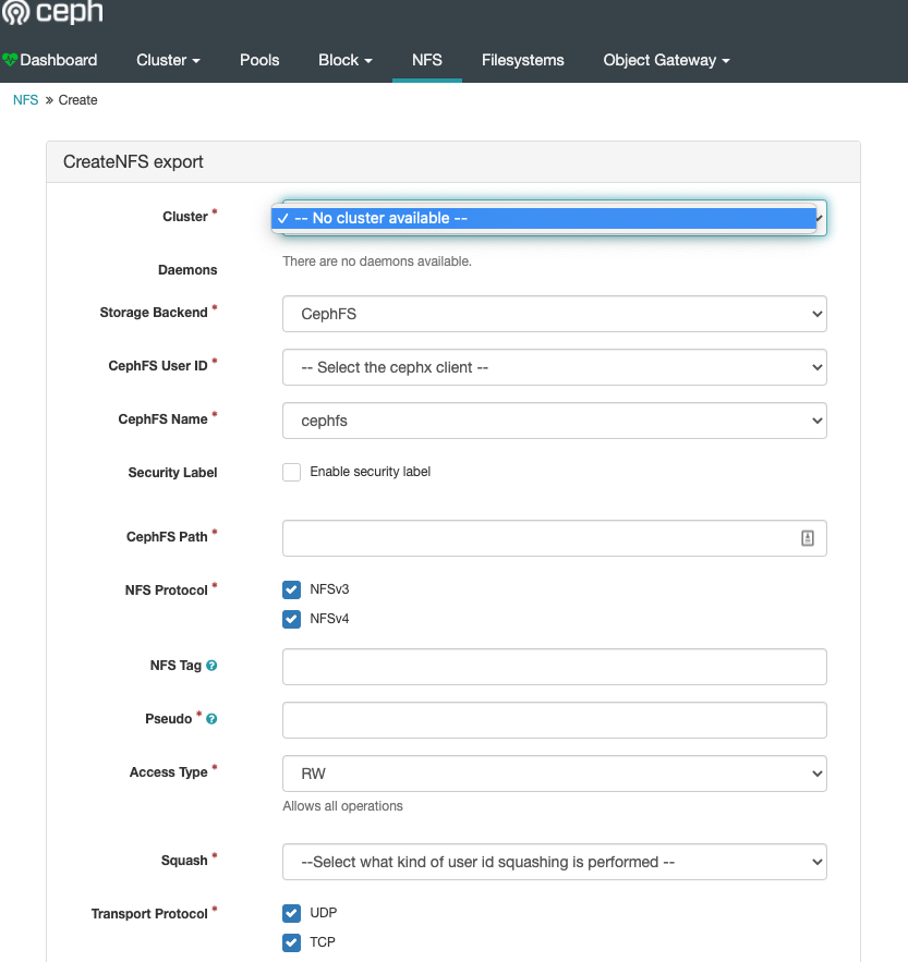 I was about to log a new bug related to this, however I saw this as a related issue and thought it best to group it. To build up a list of NFS daemons, the dashboard looks in the configured RADOS pool for Bug 1: The ceph-nfs role does not create new When a daemon is available and an export is created via the dashboard, two things then happen.