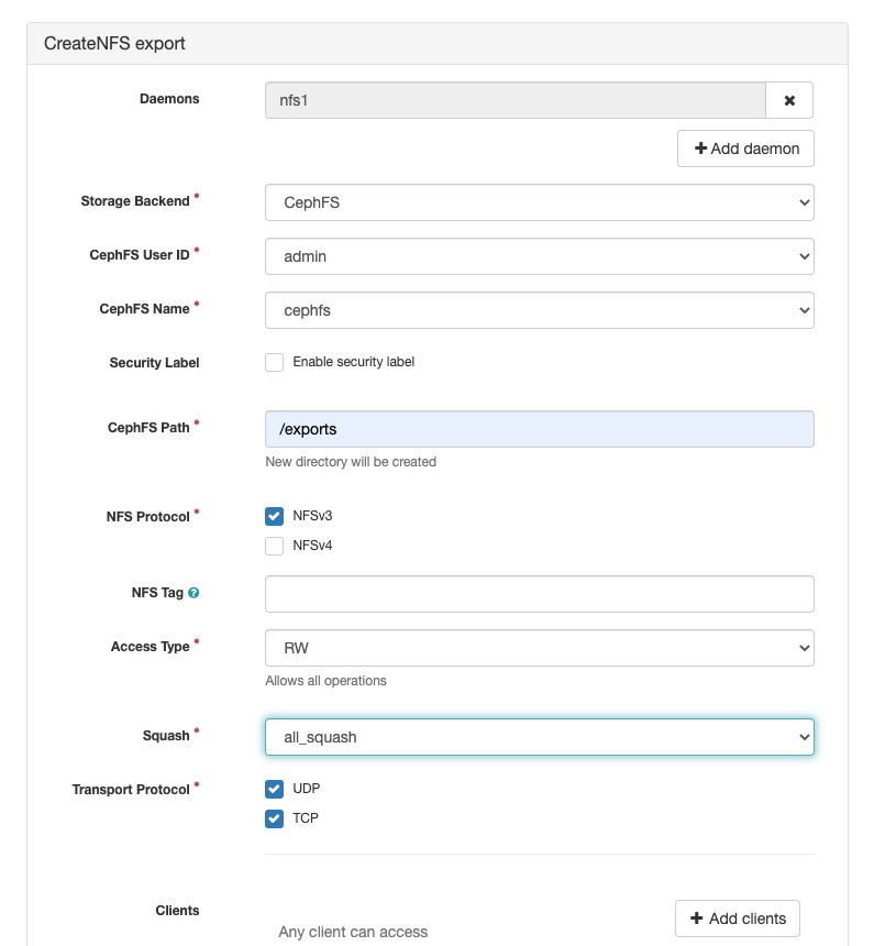 We probably need to investigate more on the Ganesha configuration in the Ceph Dashboard. https://docs.ceph.com/docs/master/mgr/dashboard/#nfs-ganesha-management As you mentioned we need to run one extra |