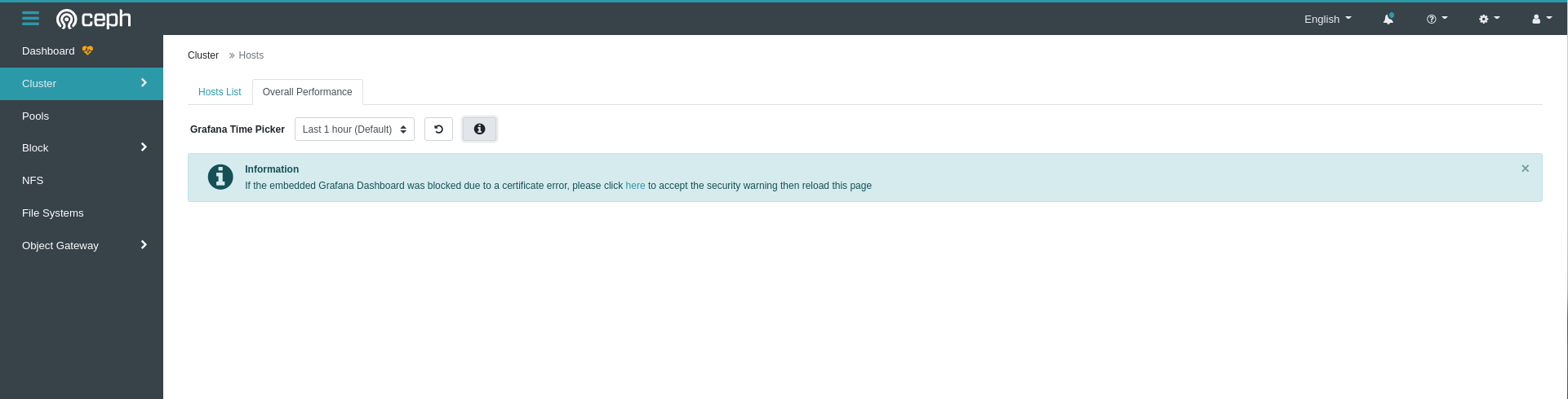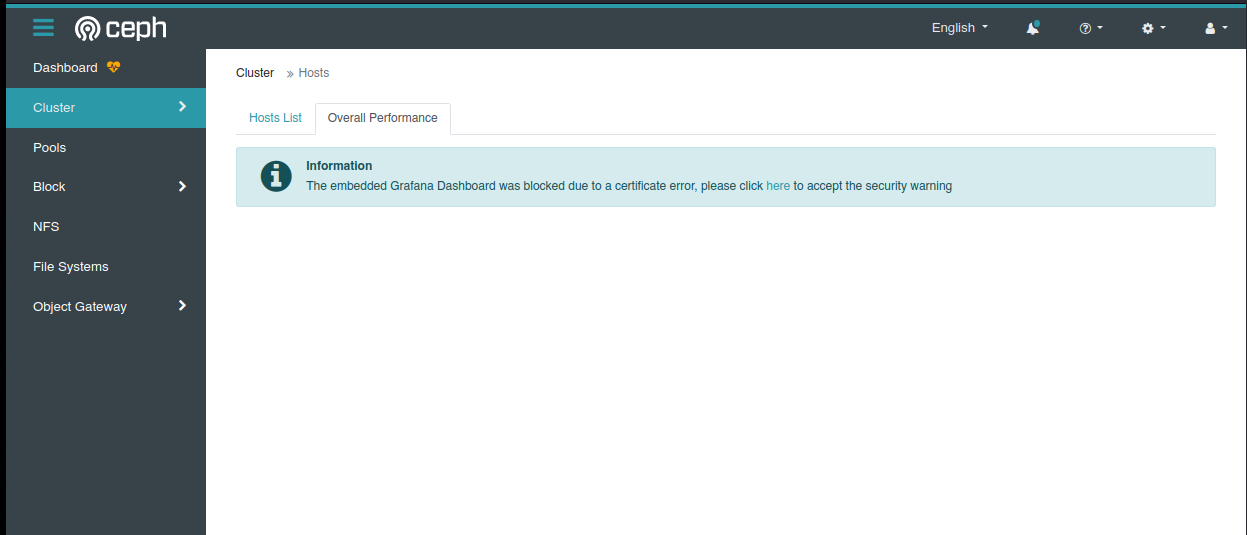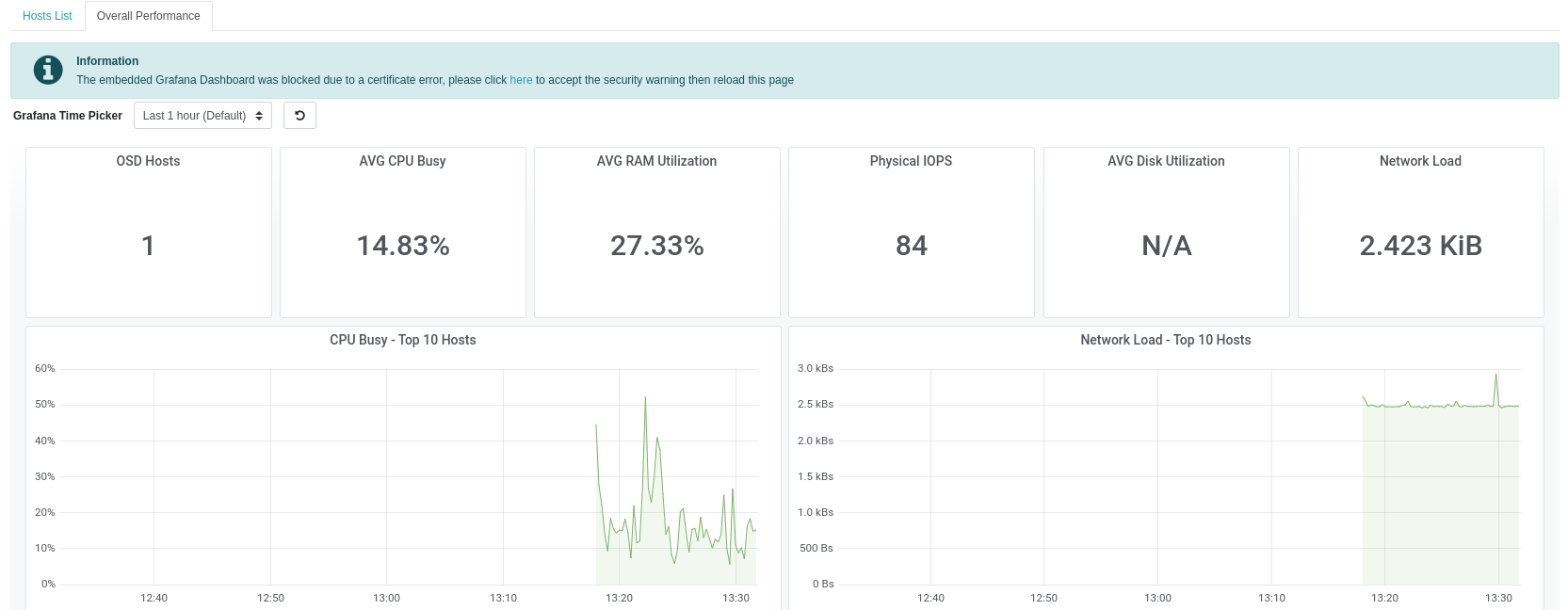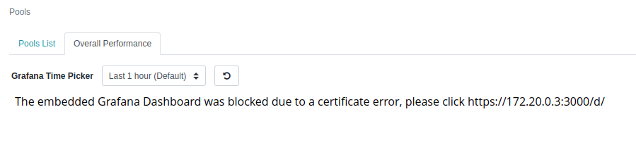 @nSedrickm have you tested if the error warning badge disappears when the user accepts the invalid certificate? At least in my case it didn't work and the reason is that what the There you see 2 simultaneous failures: the first one is a 500 coming form the Dashboard back-end when trying to access Grafana from the backend, and the second one is from the front-end, when the browser tries to embed Grafana inside the That's basically because you accept the Grafana self-signed certificate in your browser, but the Dashboard back-end doesn't know anything about browsers. It uses the Therefore you have to modify that part of the back-end code to launch a So the problem is still there! Lesson learnt: you cannot rely on the back-end for this. You have to do your magic with just the front-end. Let's explore the alternatives: