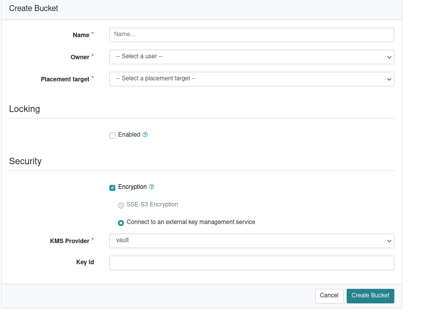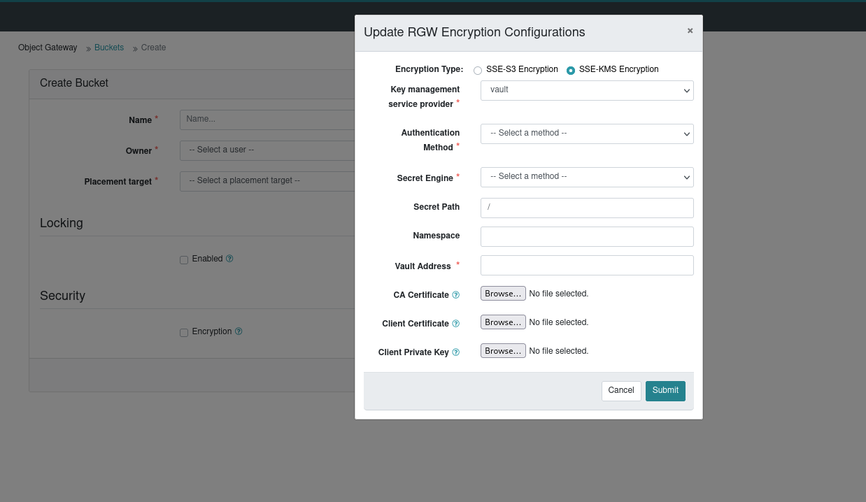 does the dashboard allow you to enable/disable encryption policy on existing buckets, or is this just during bucket creation? i don't really like the idea of the dashboard overriding config variables this way. what if they're already set on some/all rgws? |