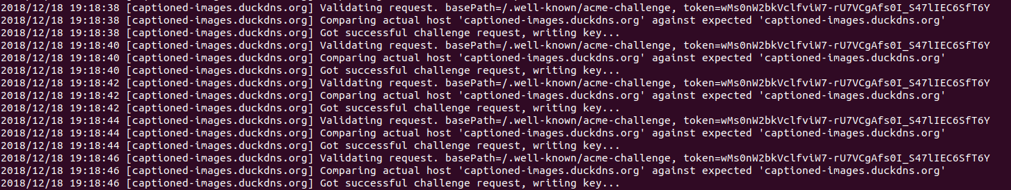 acme: authorization for identifier captioned-images.duckdns.org is invalid), the process repeats with a new challenge/path, then fails again, until Let's Encrypt rate limits me, ad infinitum.Expected behaviour: