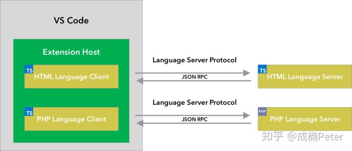 这是一张HTML语言服务协议和PHP语言服务协议的图,PHP和HTML实现了这种服务,而客户端通过JSON RPC这种远程调用,在VSCode插件进程内初始化这些语言服务。(语言服务运行在插件进程内)。语言客户端是作为一个扩展进程,而服务端则单独起了个服务,并且服务端可以用任何语言来实现。