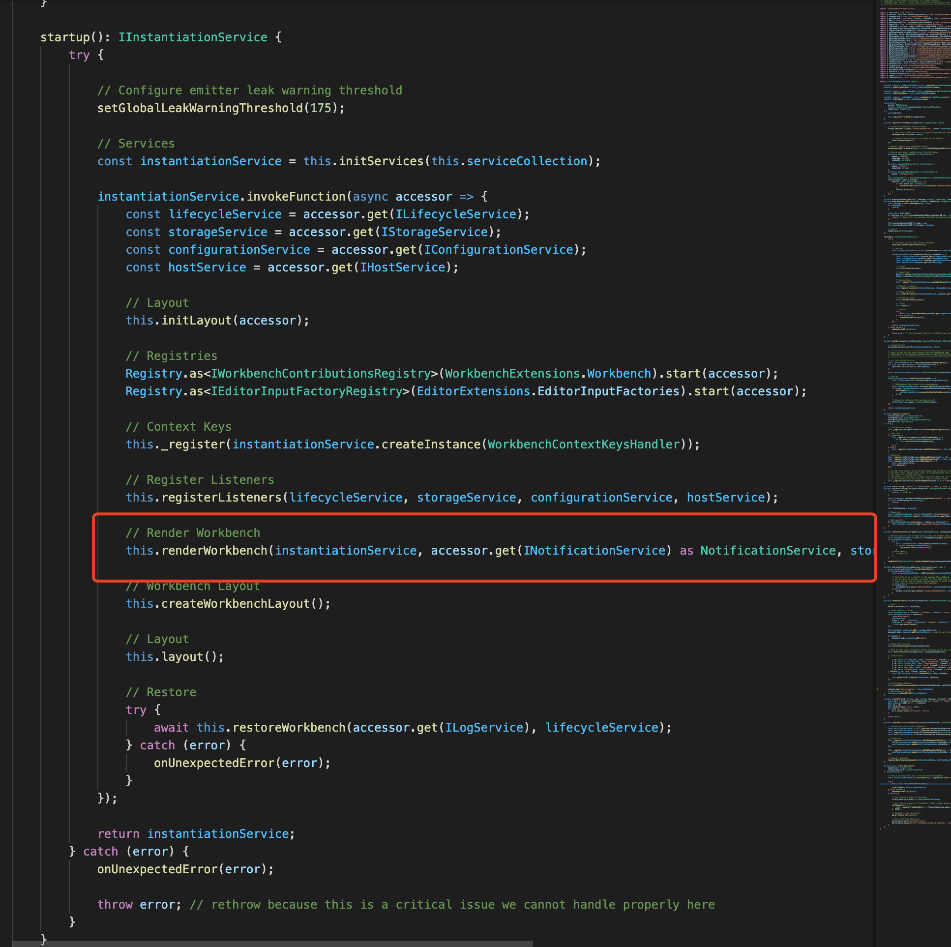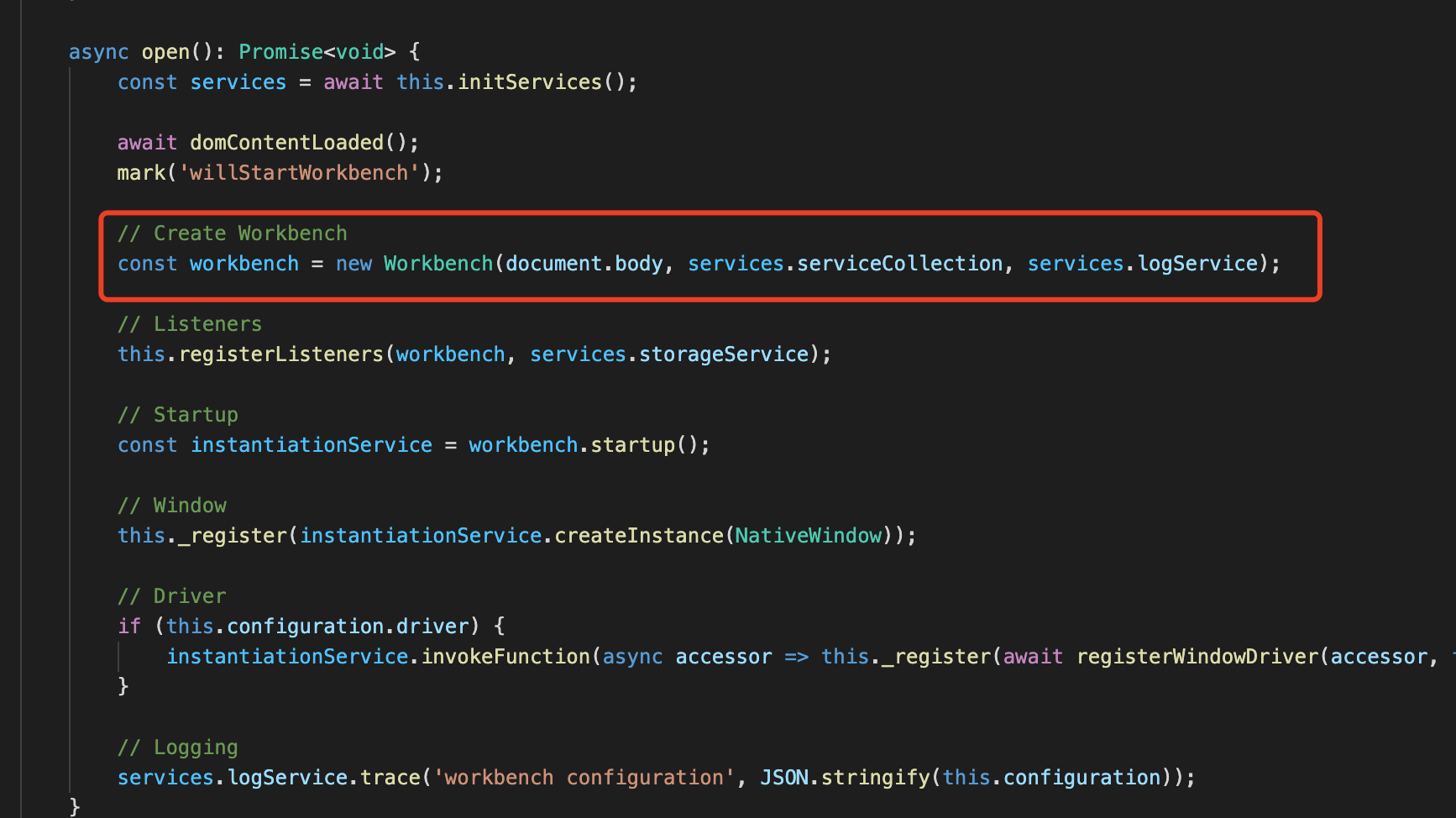 - DesktopMain 的 open 方法主要就是创建一个 WorkBench 实例, 并执行一些初始化和事件监听操作。之后执行 workbench.startup 来渲染界面