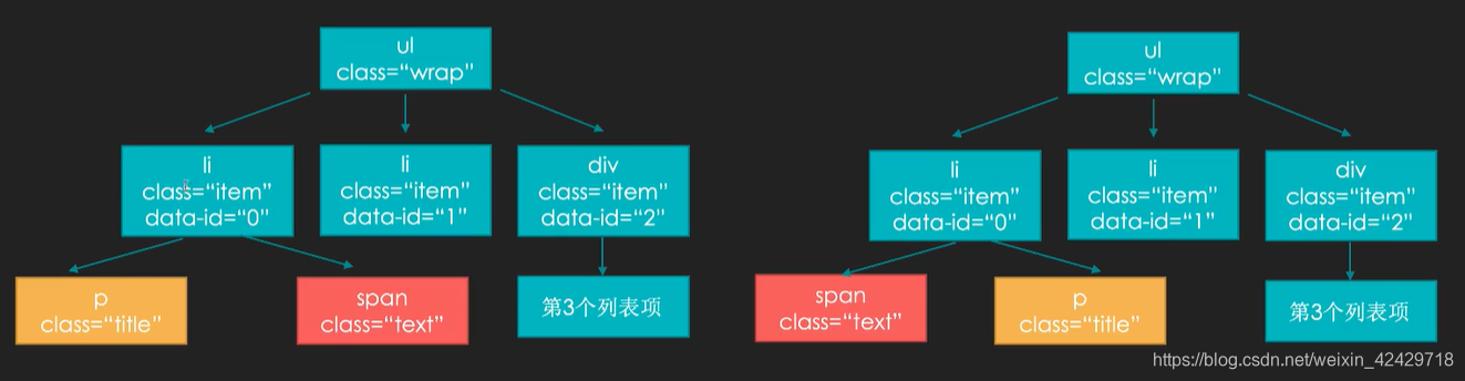 对于下图中,如果对于新旧虚拟dom中,我们的变化只是交换了一个虚拟节点,此时就不需要重新渲染了,直接替换就好了。