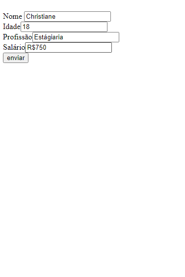 teste-php primeiro passo de uma criação em php request.php <title>GET e POST</title> Nome Idade Profissão Salário acao.php "; echo "Idade: ".$_POST['idade'].""; echo "Profissão: ".$_POST['profi'].""; echo "Salário: R$ ".$_POST['sal']."";