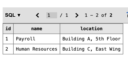 # => [(1, 'Payroll', 'Building A, 5th Floor'), (2, 'Human Resources', 'Building C, East Wing')]We can also use VS Code's SQLITE Explorer to show the table results. Click the "Show Table" arrow to view the table rows:
