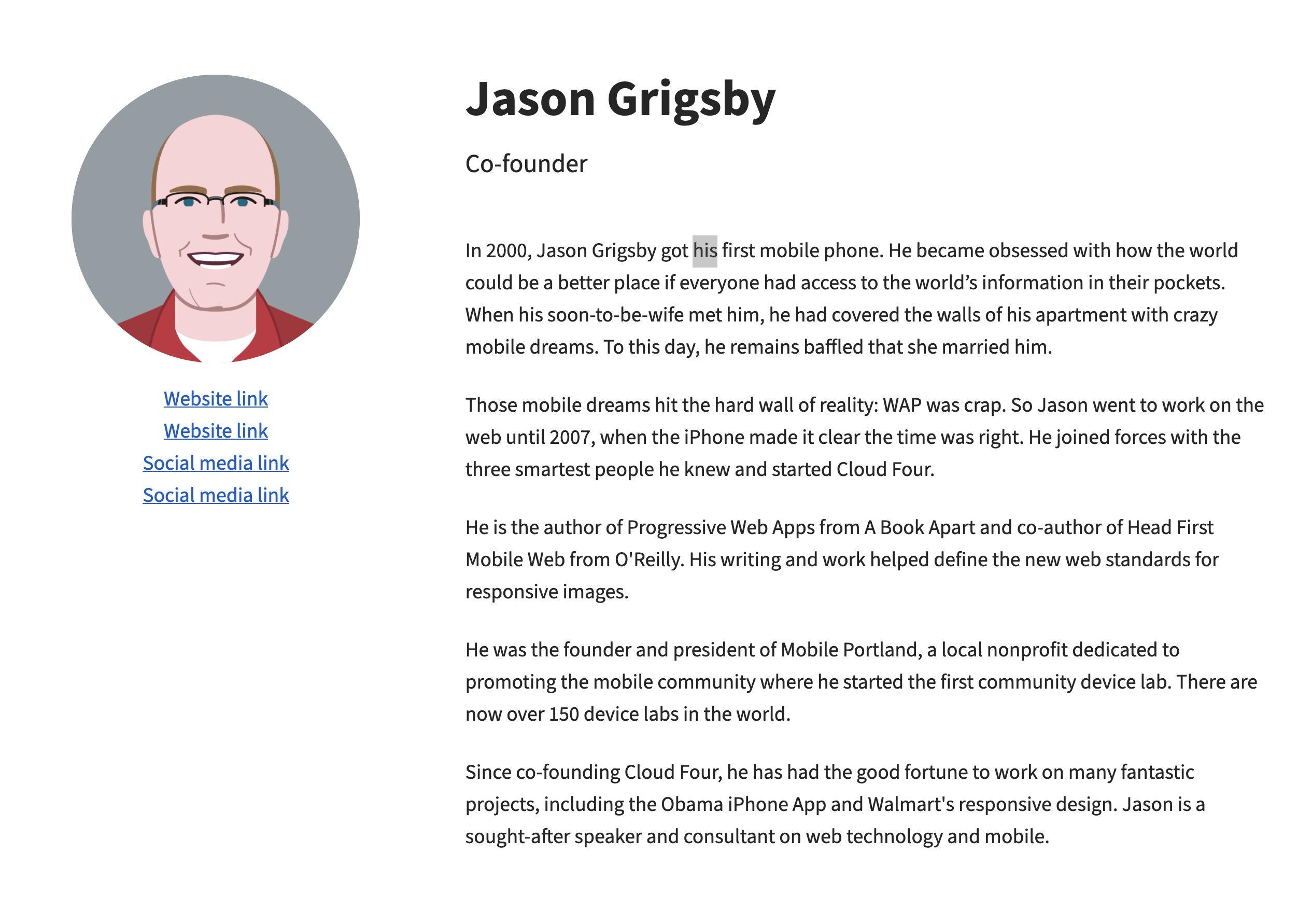 For the individual bio, it utilizes the Feature Group object with some tweaks: