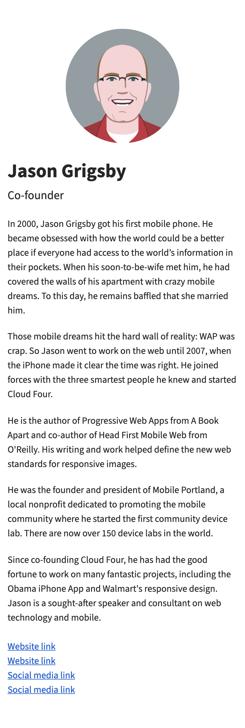 It would be useful to have a layout object that considers all of these elements: The spacing between the columns, the size of the avatar, the location of the social media links, etc.