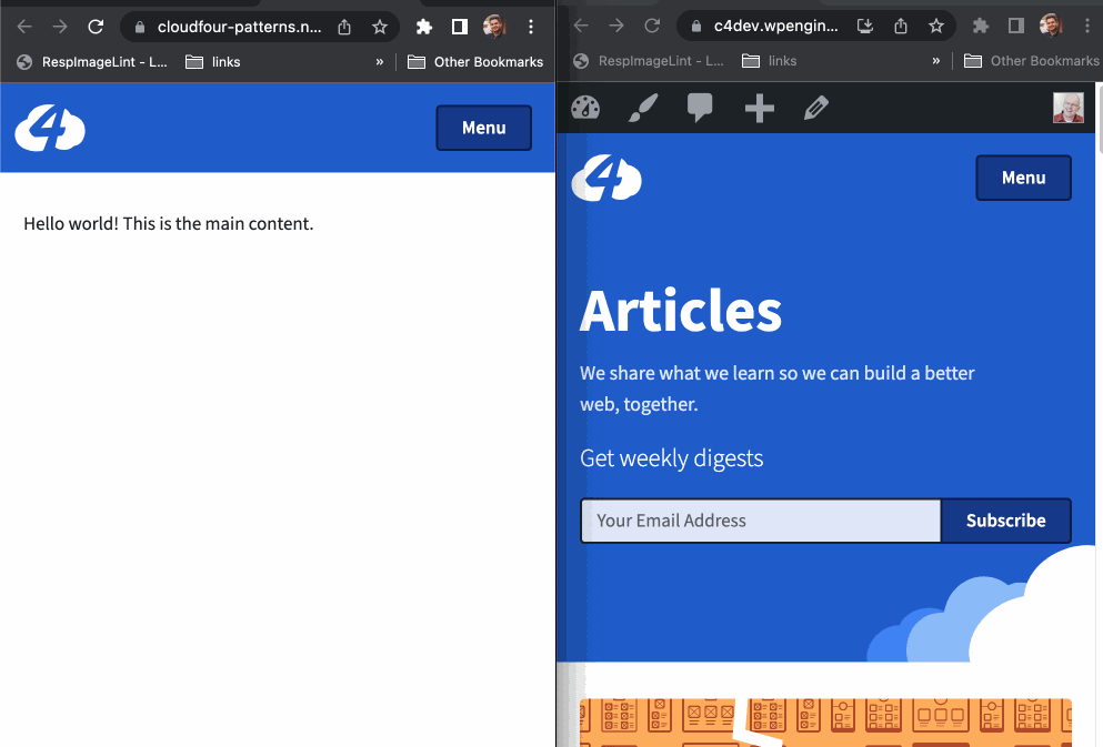 Regression? Left: https://cloudfour-patterns.netlify.app/iframe.html?args=&id=components-sky-nav--dark&viewMode=story Right: https://c4dev.wpengine.com Notice on the left how the content below the nav also animates down/up. Notice on the right how the content snaps down/up instead.