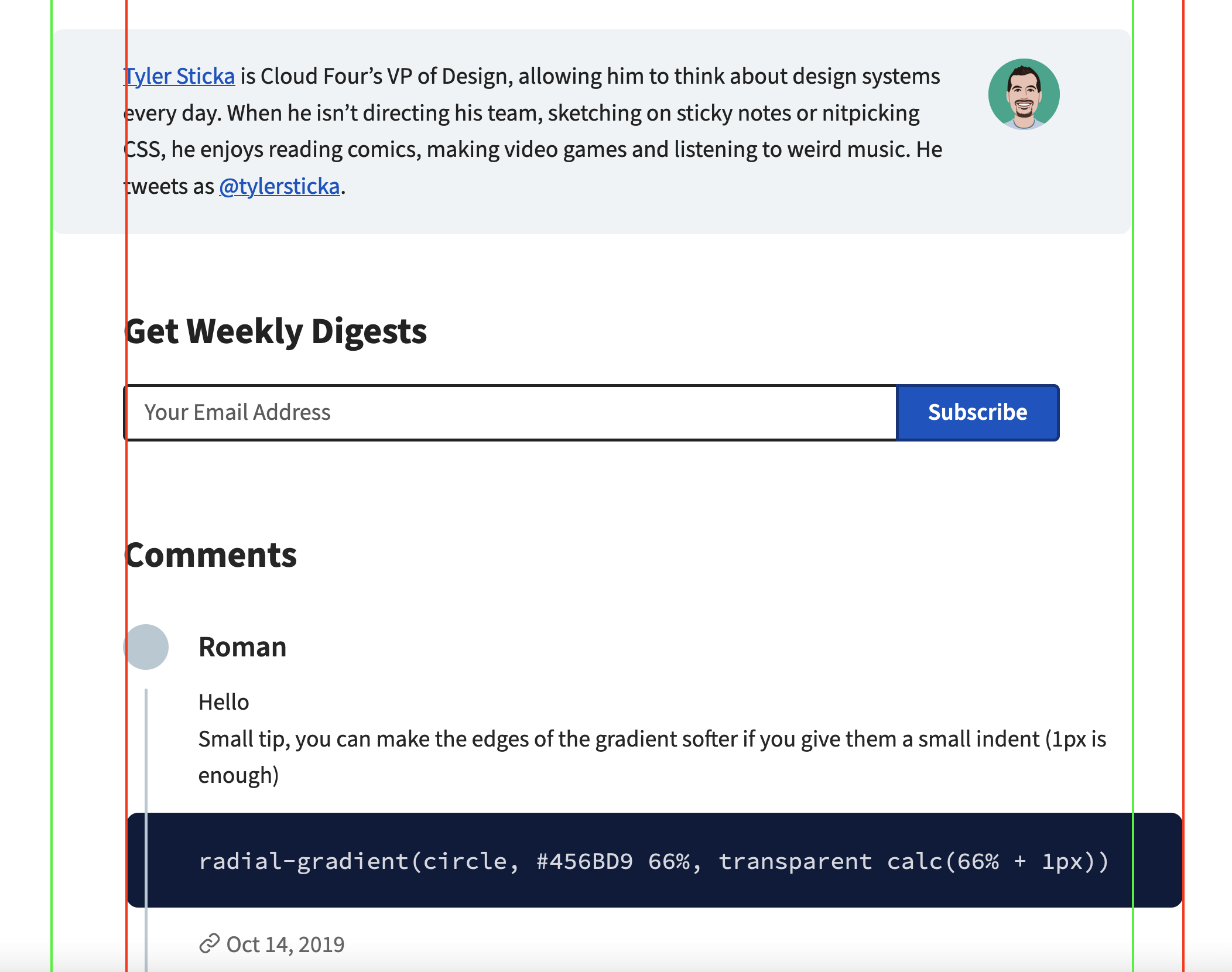 Code blocks inside of comments seem to be extending too far. In this screenshot I'm comparing the edges of the short bio in this article with the edges of the comment: