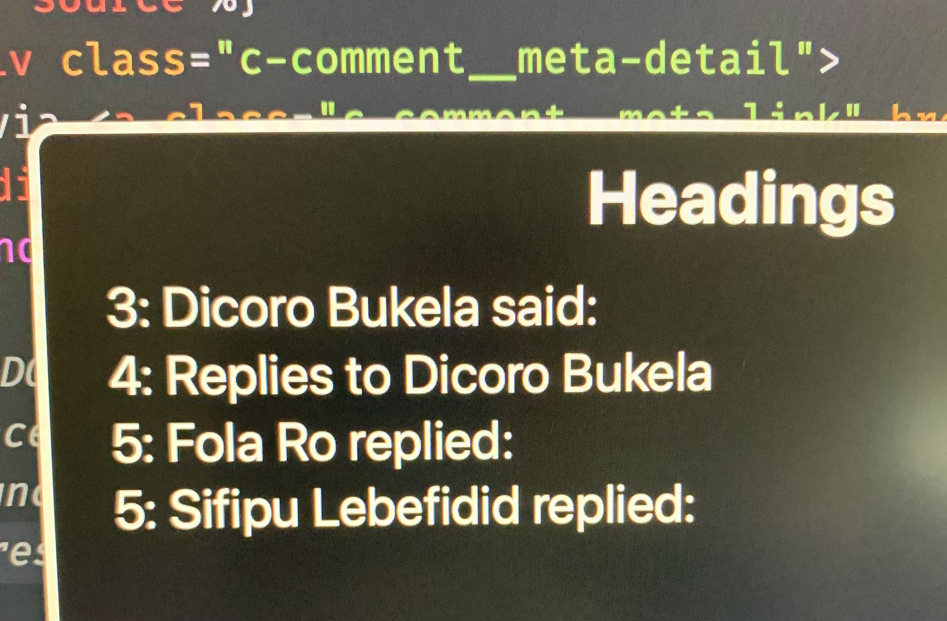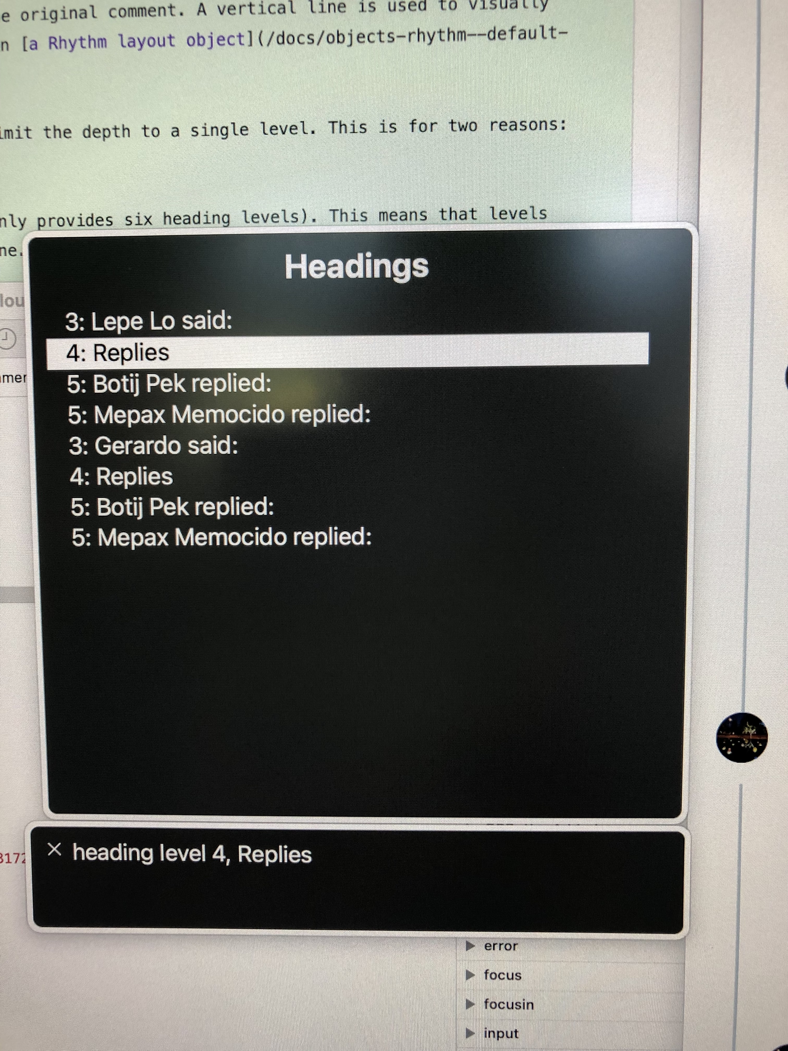 @gerardo-rodriguez I've made a slight adjustment based on this observation, adding the original comment author's name to the "Replies" heading. I think this makes the headings more distinct and the relationship a bit more clear between heading levels now.