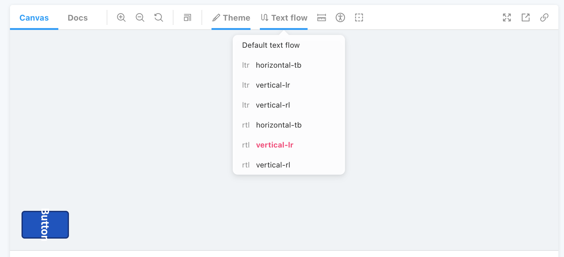 directionandwriting-modesettings. The Storybook add-ons related to this seem pretty far out of date, but then I saw that this was one of the use cases for the global toolbar settings we're already using for themes. I found managing separate toolbars fordirectionandwriting-modea bit unwieldy, so instead I consolidated these into a "text flow" item.Along the way, I noticed that our Theme toolbar did not include all of our themes. So I modified it to support
