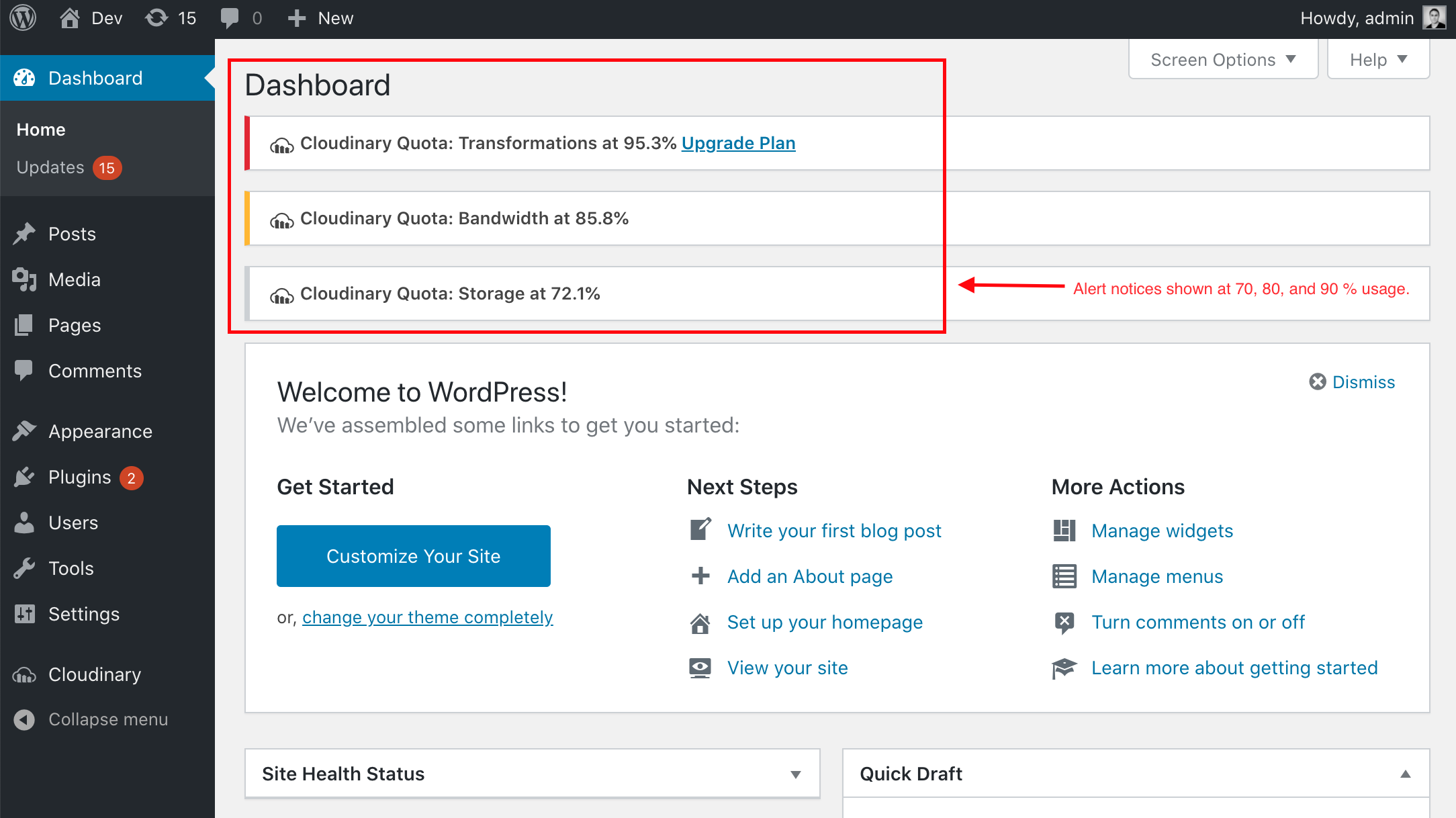 Alert/Admin notices shown at 70%, 80%, and 90% (with a link to upgrade at 90%)