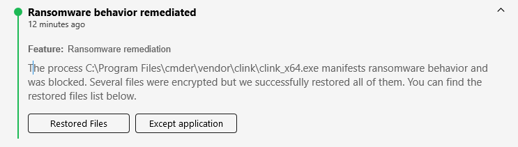 I'm not sure what to call this, but I think it is an issue. My antivirus(Bitdefender) spotted ransomware behavior at cmder/vendor/clink. I think its worth checking if its a false positive?