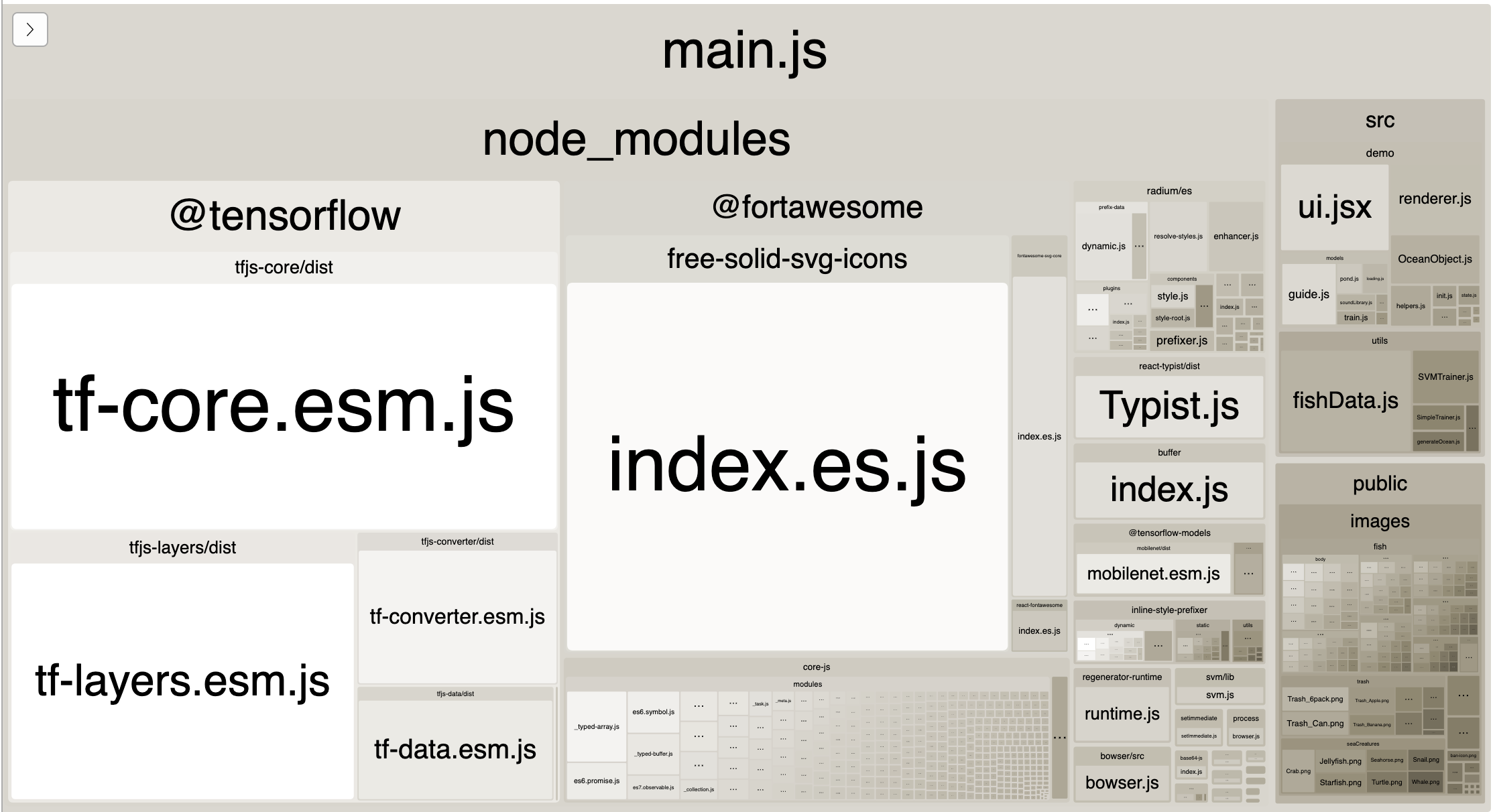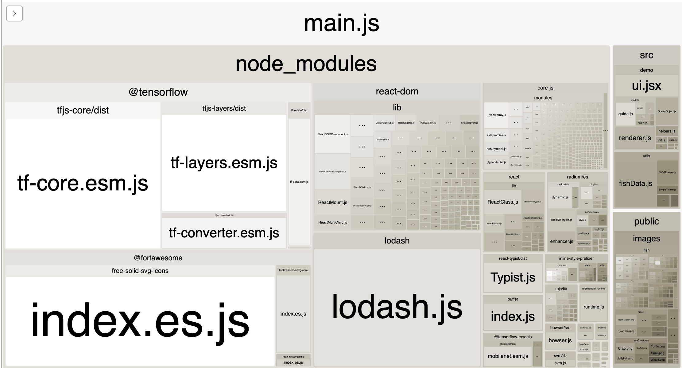 main.js(used within Code Studio) by 34%: from 9885072 bytes to 6546734 bytes by keeping four packages out of our bundle and labeling them asexternals:lodash,radium,react, andreact-dom. These are now listed aspeerDependenciesby our package, indicating that we expect anyone linking our package to also link those packages alongsideml-activitiesproduction(main.js) when runningyarn start- we only do this when runningyarn buildnowpackage.json: jquery-ui-touch-punch, jquery-ui, react-bootstrap, react-colorwebpack-bundle-analyzeras a devDependency so we can easily invoke it if we want to understand our bundle (and generate pretty pictures like the ones below)Before: