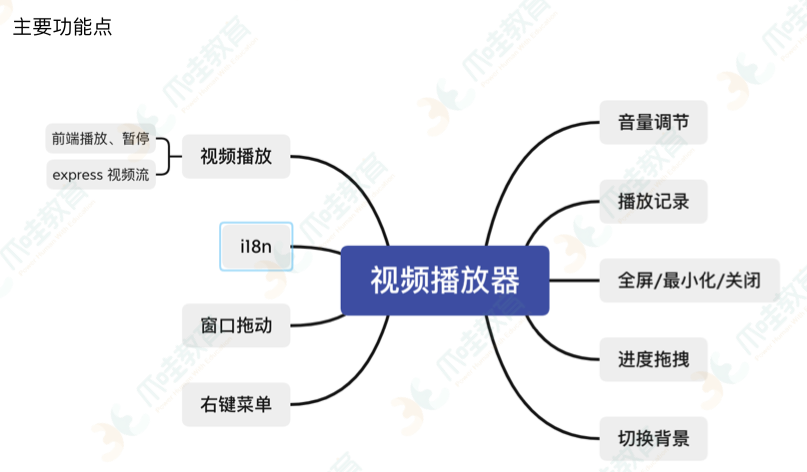 Electron-Player 视频播放器 主要功能点 1、视频播放,前端播放,后端视频流 2、键盘事件 3、⾳量调节 4、播放记录 5、全屏/恢复,最⼩化,关闭 6、进度拖拽,快进,快退 7、切换背景 8、右键菜单功能 9、窗⼝拖动 10、i18n 多语⾔ 代码结构设计