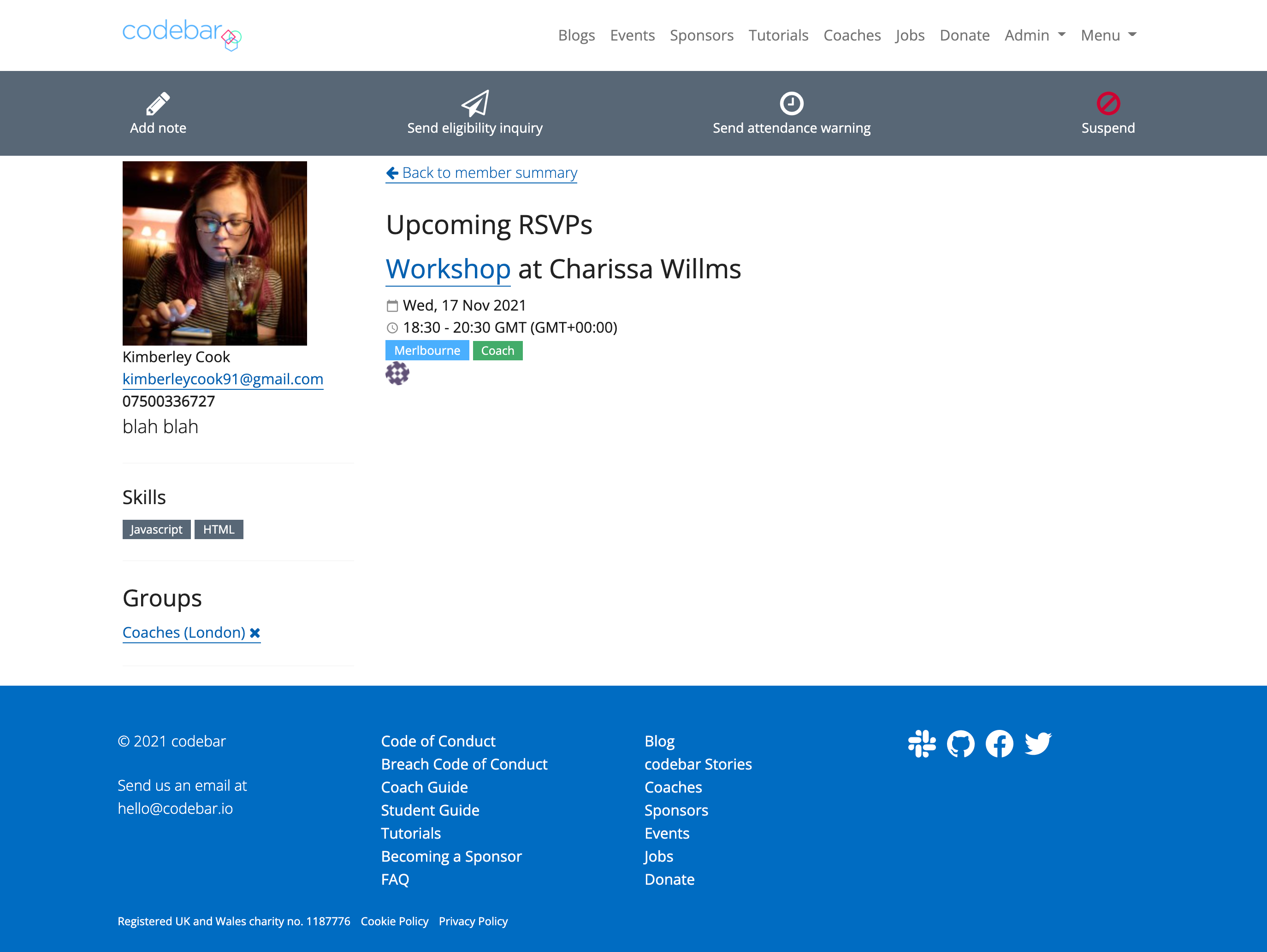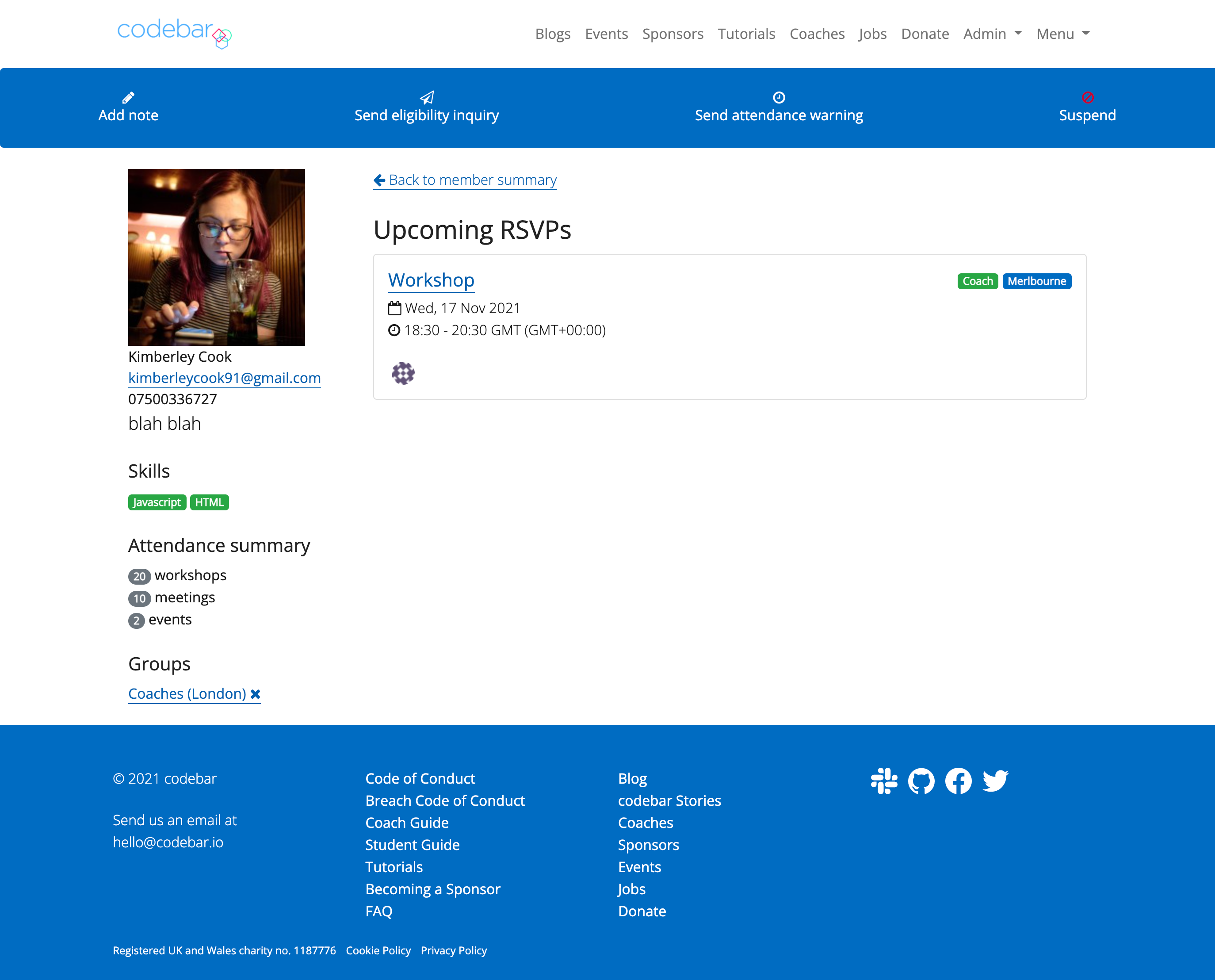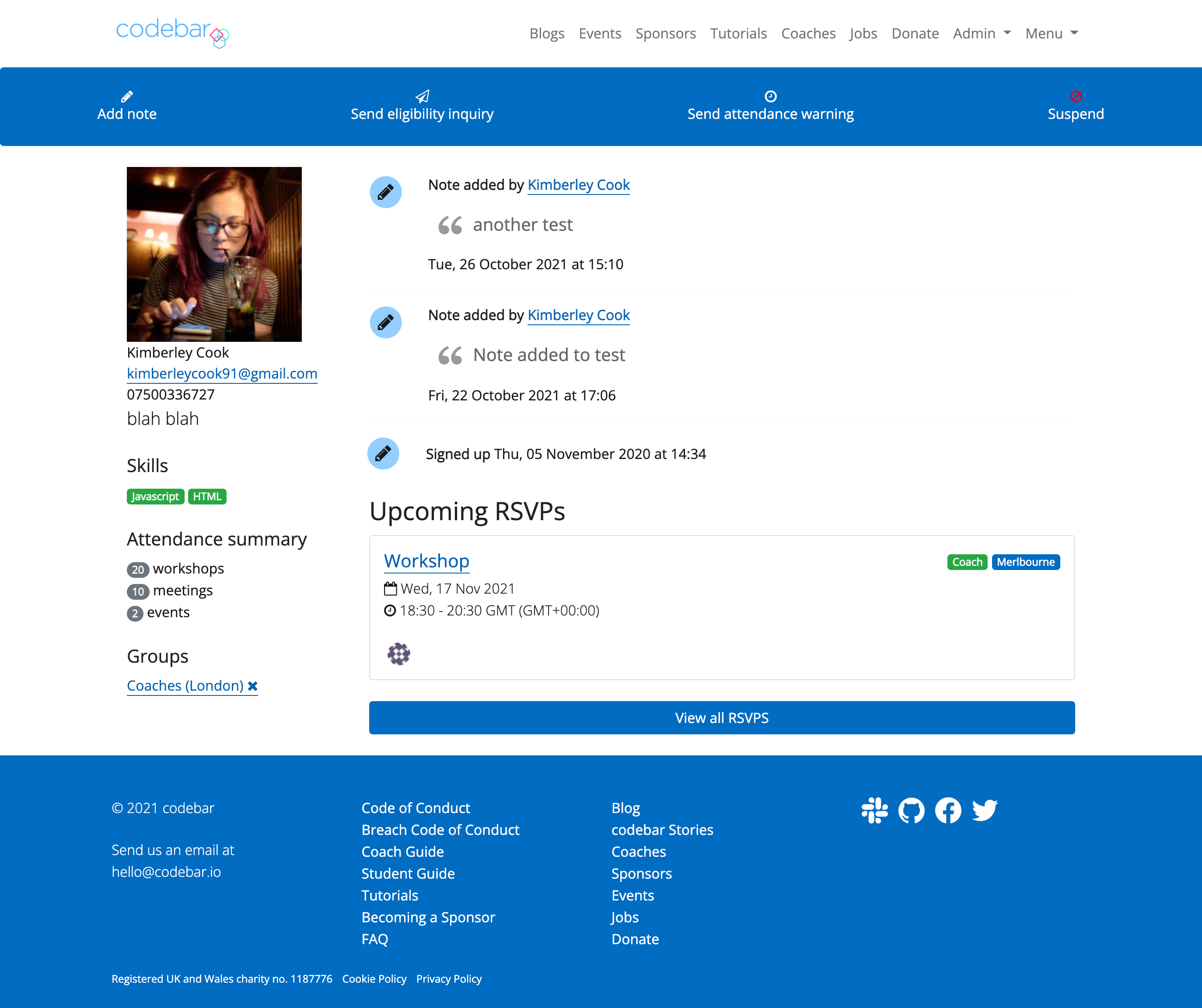 Although mainly doing this page because it is broken and we've had feedback from organisers but, when the redesign was added a few months back one bit that is missing which I used often was what the student had worked on during their workshops. I checked this often before chatting with someone to understand what work they had been doing during the workshops.