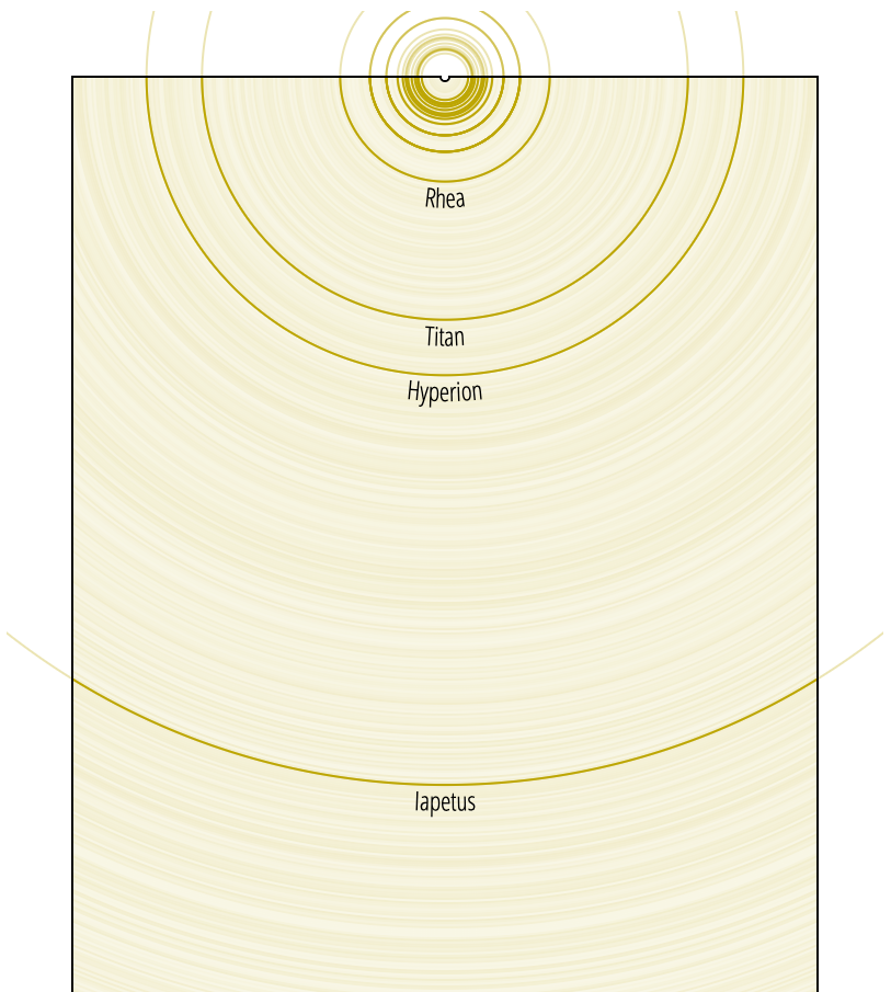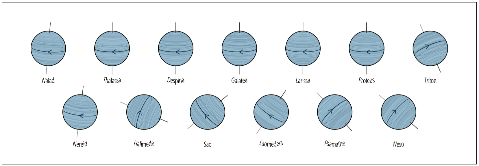 The orbital paths of all the moons are shown in the center-right section, illustrating the size, shape and orientation of each: