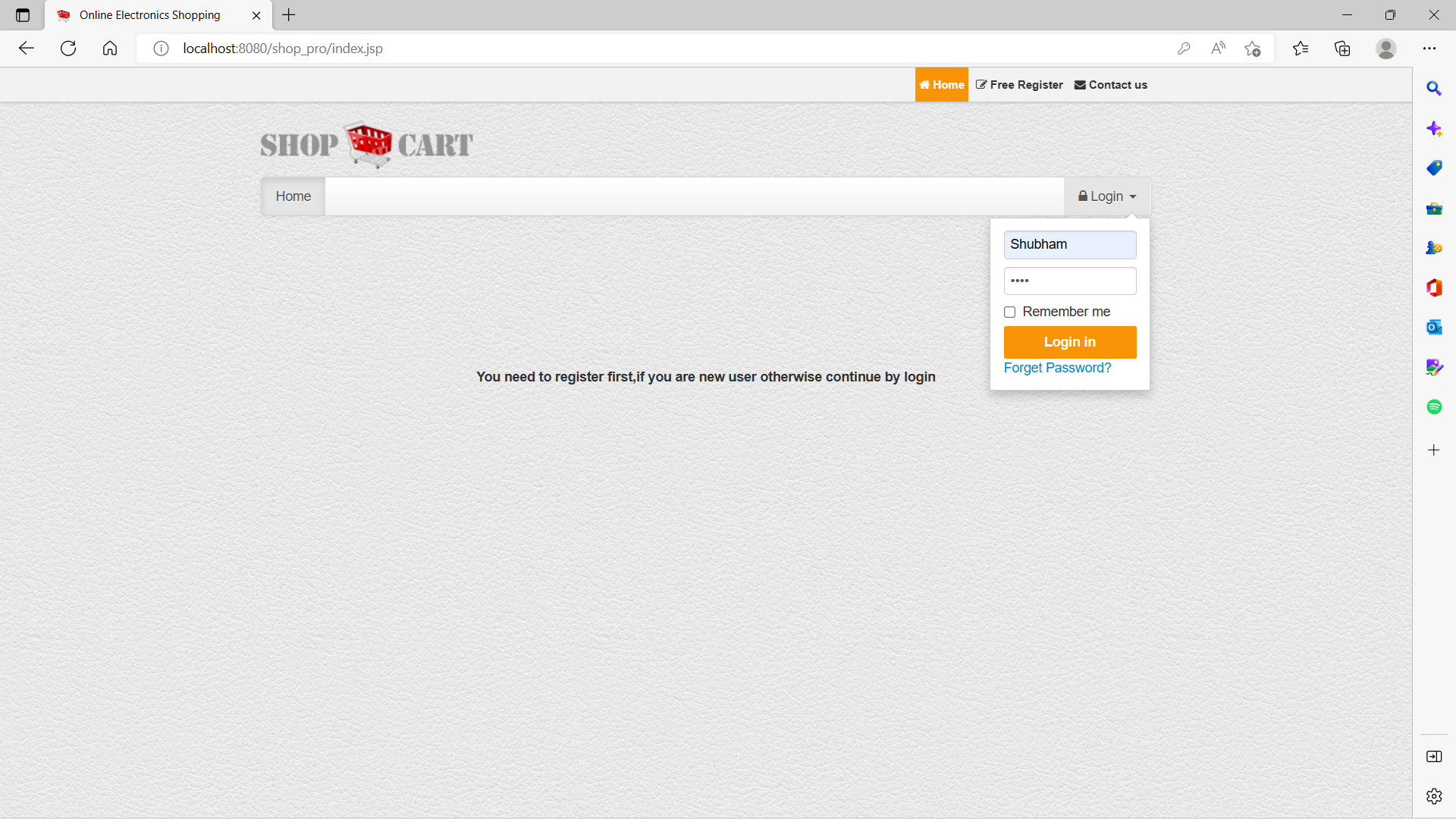 The theme of the project is Online Electronic's Shopping .This project is basically showing the flow of pages like login,logout and new user register.Along with these pages, there is also a contact us page so that the user can contact with the developer,if there is an issue.How we can create pages and how the data flow occurs within pages as well as with the database is the basic aim of this project.