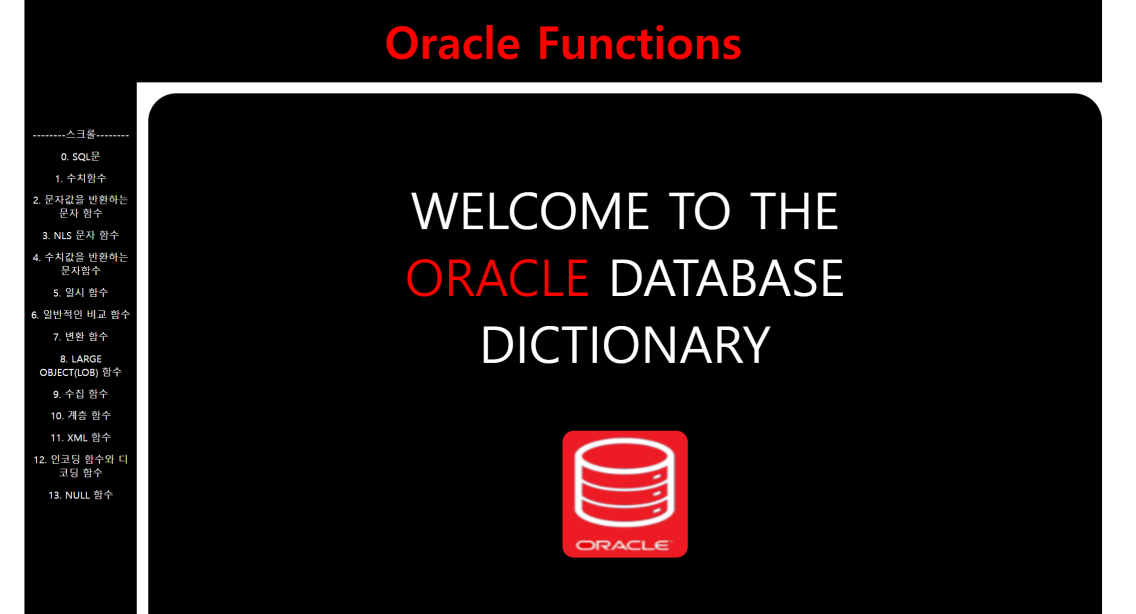 오라클의 모든 함수를 정리한 웹 페이지를 만들었다. 모든 오라클 함수들을 정리한 사이트에서 모든 오라클 함수들을 찾아내었다. 이후 Chat GPT에게 함수를 설명해 달라 하고 그 내용을 참조하였다. 실행문은 DBeaver에 실행하여 실행 결과를 확인하였다. 오라클의 모든 함수를 챕터별로 더미데이터로 만들었으며 이것을 map을 통해 전부 돌린 간단한 웹 사이트이다.