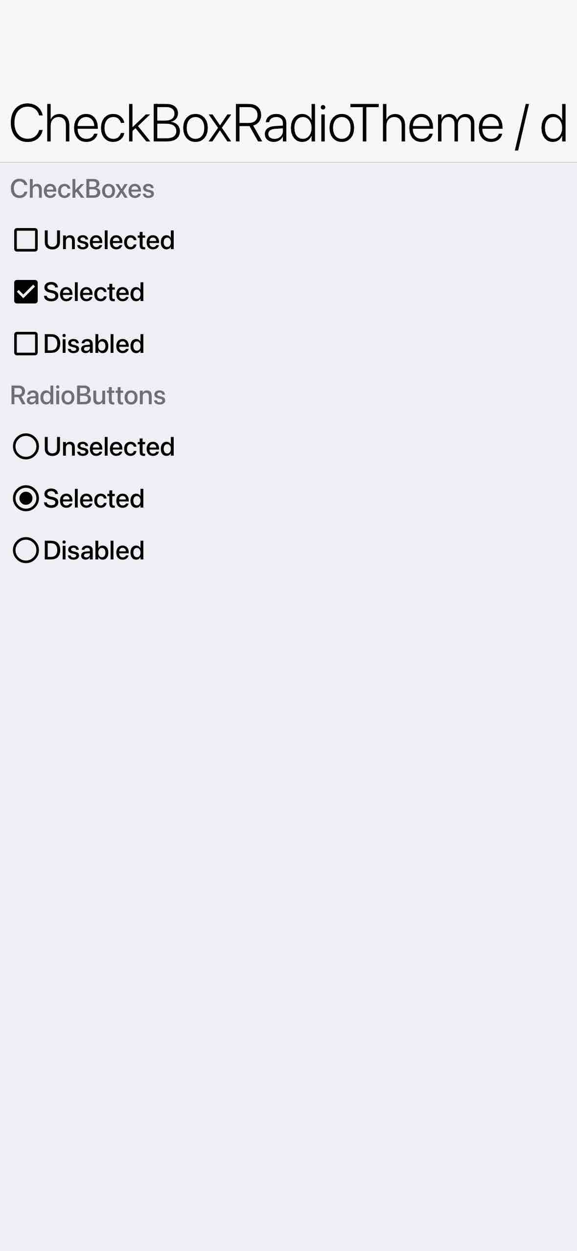 Three user-reported issues fixed in one round: 1. Dark screenshots were actually light in every test. Root cause: UIManager caches resolved Style objects per UIID in styles/selectedStyles. A Style created while CN.isDarkMode()==false is the light variant; the cache then returns it on later lookups even after Display.setDarkMode(true) flips the flag. Components built on the fresh dark Form were picking up the cached light Style. Fix in DualAppearanceBaseTest: reflectively clear UIManager.styles and selectedStyles between appearance flips (and after the test finishes) so the next Component.initLaf -> UIManager.getComponentStyle goes through the full resolution path. shouldUseDarkStyle consults CN.isDarkMode() on every call and picks up the $Dark<UIID> entries emitted by the native themes' @media (prefers-color-scheme: dark) block. 2. iOS CheckBox / RadioButton disabled state looked weak. Previously only "color: #c7c7cc" was set on .disabled so the only visible change was a slightly lighter check glyph. Add a background-color: #e5e5ea (tertiary surface) for light and #2c2c2e for dark, plus an explicit transparent background on the default state. RadioButton also now inherits CheckBox's padding + base background instead of just deriving the label. 3. Test coverage was too thin (only Button/TextField/CheckBoxRadio/Toolbar). Added nine more theme-fidelity tests under scripts/hellocodenameone: - SwitchThemeScreenshotTest (OnOffSwitch default/on/disabled) - PickerThemeScreenshotTest - TabsThemeScreenshotTest - MultiButtonThemeScreenshotTest (1..4 line variants) - ListThemeScreenshotTest - DialogThemeScreenshotTest (inline Dialog/DialogBody/DialogTitle/ DialogCommandArea to avoid modal animation flake) - FloatingActionButtonThemeScreenshotTest - SpanLabelThemeScreenshotTest - DarkLightShowcaseThemeScreenshotTest (mixed-components stress) All registered in Cn1ssDeviceRunner; each emits light+dark pair. Co-Authored-By: Claude Opus 4.7 (1M context) <noreply@anthropic.com>