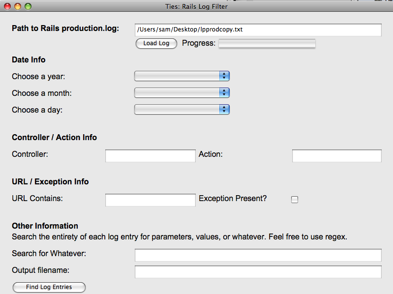 Enter the path to a Ruby on Rails production log file, click the "Load Log" button and it reads in the file. Then, choose from the years, months, and days of requests in that file. Tell Ties which controller, action, and URL you are interested in. Finally, decide if you only want to see the log entries which contain an exception, enter a regular expression to search the params, plus the output filename and click a button to filter the log entries you care to see.