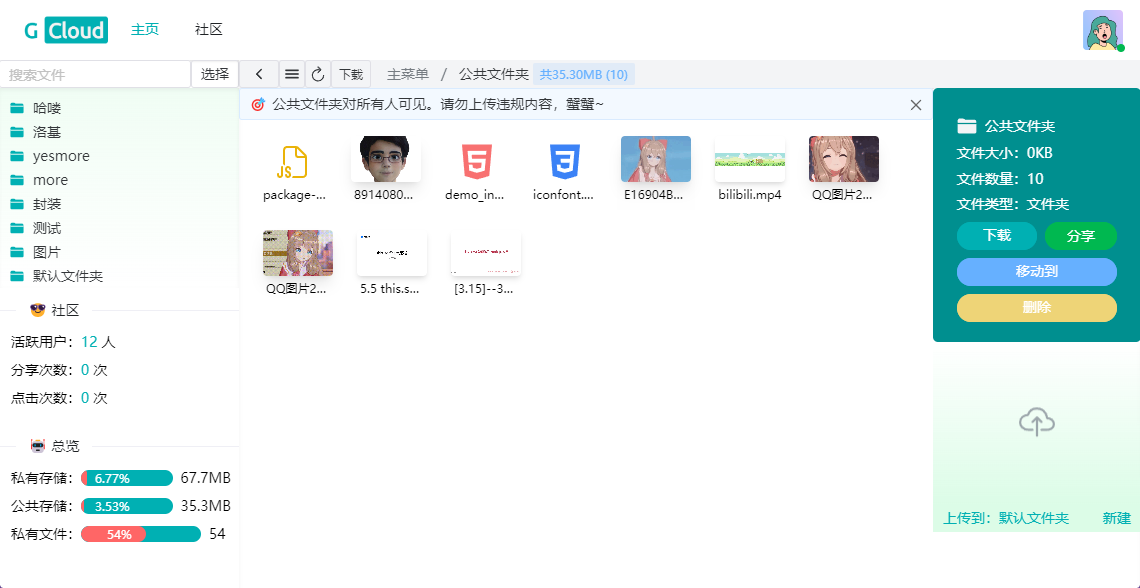 GCloud 是使用 Vue3 + Go(后端)开发的云盘应用,具备云盘的基本功能,且开源免费。另外,GCloud 是作为学习 Go 语言的项目而存在,所以不具备大容量存储功能(存储上限为 200MB),开发者可以 fork 此项目并自行开通无上限的存储功能(基于腾讯云对象存储 COS,详见 COS 开通方法)共个人使用、学习等。祝您体验愉快~
