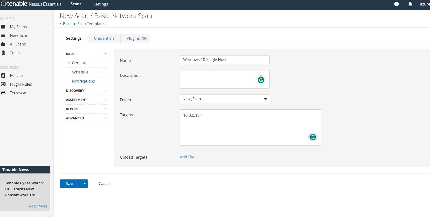 - In Nessus, we are going to create a new scan. Basic Network Scan < Settings. After naming the scan, the IP address of the VM can be placed under "Target". Then, click on "My Scans" and run the scan.