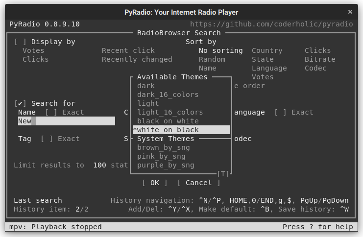 Entering the radio browser with 'O' form the default menu and then searching with 's', under "Search for [Name]", typing the letter 't' causes the themes menu to pop up. Every other letter works. I also tried copy/pasting my search query and the theme menu would pop up regardless, with the search entry incomplete. The example query being 'Newtown Radio':