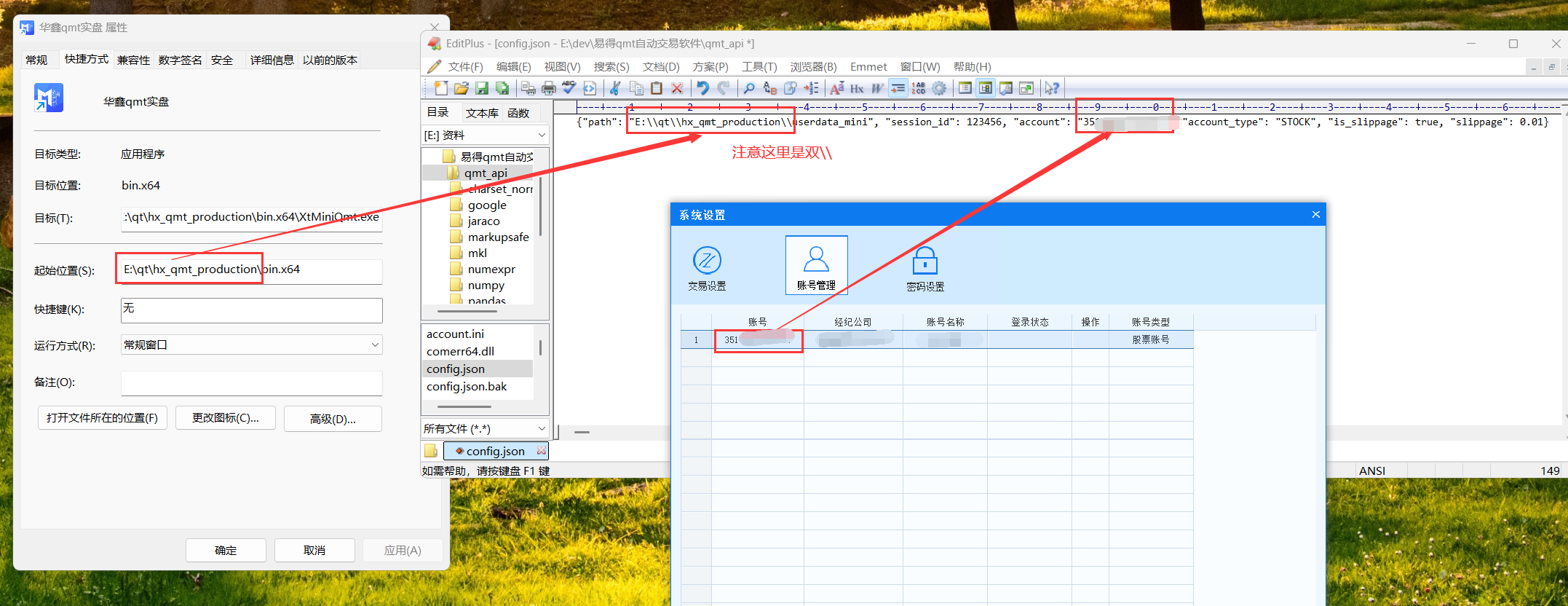 这里的资金账号要填入qmt_api文件夹的config.json文件里面,另外还有填入qmt所在的文件夹路径,如下: