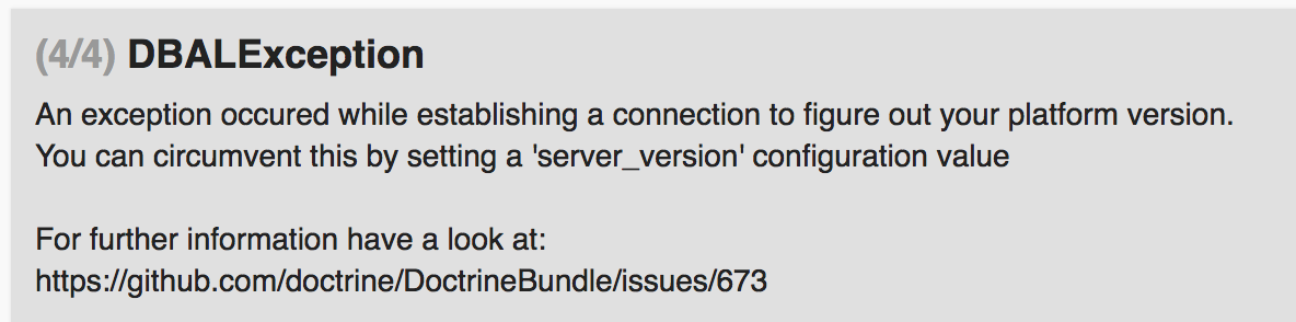 [2018-03-12 17:11:44] request.CRITICAL: Uncaught PHP Exception Doctrine\DBAL\DBALException: "An exception occured while establishing a connection to figure out your platform version. You can circumvent this by setting a 'server_version' configuration value For further information have a look at: https://github.com/doctrine/DoctrineBundle/issues/673" at /www/XXX/vendor/doctrine/doctrine-bundle/ConnectionFactory.php line 96 {"exception":"[object] (Doctrine\\DBAL\\DBALException(code: 0): An exception occured while establishing a connection to figure out your platform version.\nYou can circumvent this by setting a 'server_version' configuration value\n\nFor further information have a look at:\nhttps://github.com/doctrine/DoctrineBundle/issues/673 at /www/XXX/vendor/doctrine/doctrine-bundle/ConnectionFactory.php:96, Doctrine\\DBAL\\Exception\\ConnectionException(code: 0): An exception occurred in driver: SQLSTATE[HY000] [2002] No such file or directory at /www/XXX/vendor/doctrine/dbal/lib/Doctrine/DBAL/Driver/AbstractMySQLDriver.php:108, Doctrine\\DBAL\\Driver\\PDOException(code: 2002): SQLSTATE[HY000] [2002] No such file or directory at /www/XXX/vendor/doctrine/dbal/lib/Doctrine/DBAL/Driver/PDOConnection.php:47, PDOException(code: 2002): SQLSTATE[HY000] [2002] No such file or directory at /www/XXX/vendor/doctrine/dbal/lib/Doctrine/DBAL/Driver/PDOConnection.php:43)"} [][2018-03-12 17:11:44] request.CRITICAL: Exception thrown when handling an exception (Doctrine\DBAL\DBALException: An exception occured while establishing a connection to figure out your platform version. You can circumvent this by setting a 'server_version' configuration value For further information have a look at: https://github.com/doctrine/DoctrineBundle/issues/673 at /www/XXX/vendor/doctrine/doctrine-bundle/ConnectionFactory.php line 96) {"exception":"[object] (Doctrine\\DBAL\\DBALException(code: 0): An exception occured while establishing a connection to figure out your platform version.\nYou can circumvent this by setting a 'server_version' configuration value\n\nFor further information have a look at:\nhttps://github.com/doctrine/DoctrineBundle/issues/673 at /www/XXX/vendor/doctrine/doctrine-bundle/ConnectionFactory.php:96, Doctrine\\DBAL\\Exception\\ConnectionException(code: 0): An exception occurred in driver: SQLSTATE[HY000] [2002] No such file or directory at /www/XXX/vendor/doctrine/dbal/lib/Doctrine/DBAL/Driver/AbstractMySQLDriver.php:108, Doctrine\\DBAL\\Driver\\PDOException(code: 2002): SQLSTATE[HY000] [2002] No such file or directory at /www/XXX/vendor/doctrine/dbal/lib/Doctrine/DBAL/Driver/PDOConnection.php:47, PDOException(code: 2002): SQLSTATE[HY000] [2002] No such file or directory at /www/XXX/vendor/doctrine/dbal/lib/Doctrine/DBAL/Driver/PDOConnection.php:43)"} []The text was updated successfully, but these errors were encountered: