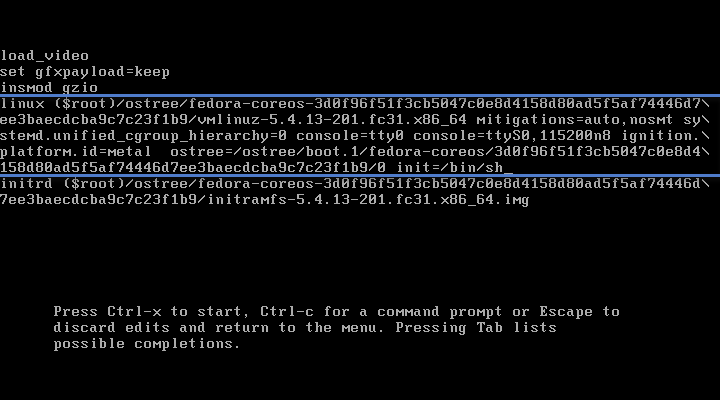 | If you've lost the private key of an SSH keypair used to log into Fedora CoreOS, and do not have any password logins set up to use at the console, you can gain access back to the machine using the `init=/bin/sh` trick: | ||