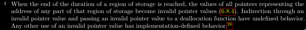 Indirection through an invalid pointer value and passing an invalid pointer value to a deallocation function have undefined behavior. Any other use of an invalid pointer value has implementation-defined behavior.