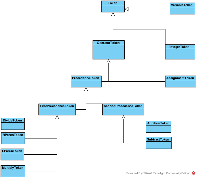 - in de interpreter.py, functie tokenize leest character voor character in en returned een token. Deze functie roept recursief tokenize aan. Afhankelijk van de character returned hij een type token. Hieronder een kort overzicht van de tokens in inheritance.
