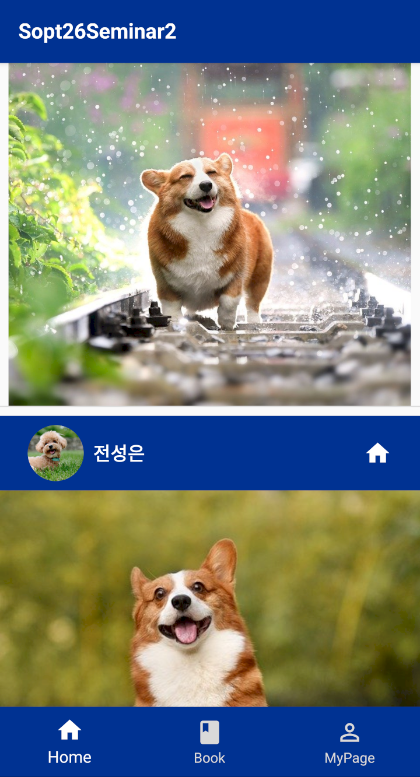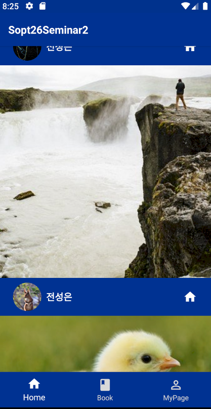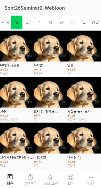 Retrofit을 활용하여 로그인과 회원가입 부분 통신을 하고, 지금까지 진행 한 내용을 하나의 프로젝트로 합쳤다. 회원가입을 하면 LoginActivity 로 가서 자동으로 로그인을 하여 MainActivity 로 넘어가고, 인스타와 웹툰 리사이클러 뷰가 나타난다.