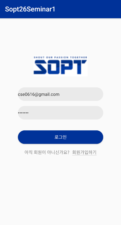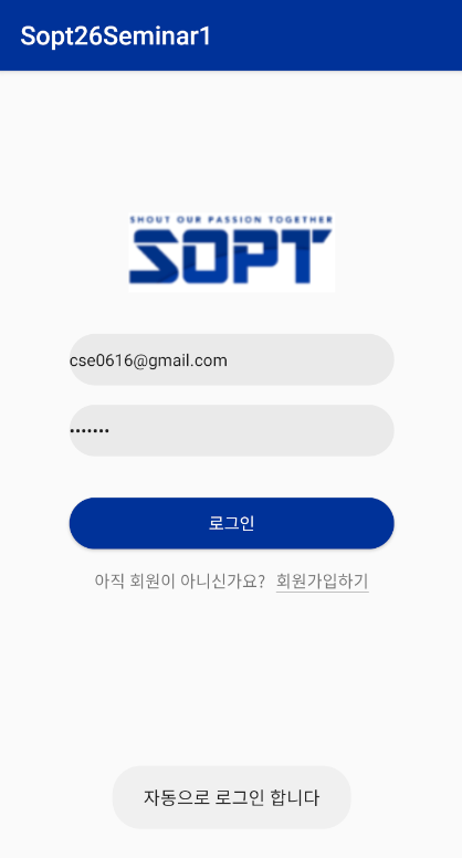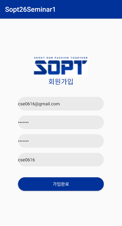 - 회원가입 완료시 LoginActivity로 돌아오고, 회원가입 성공한 id와 pw가 입력되어 있도록 구현